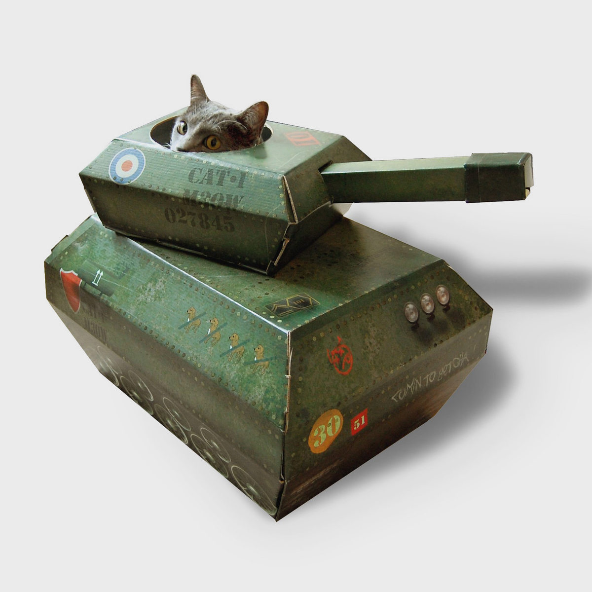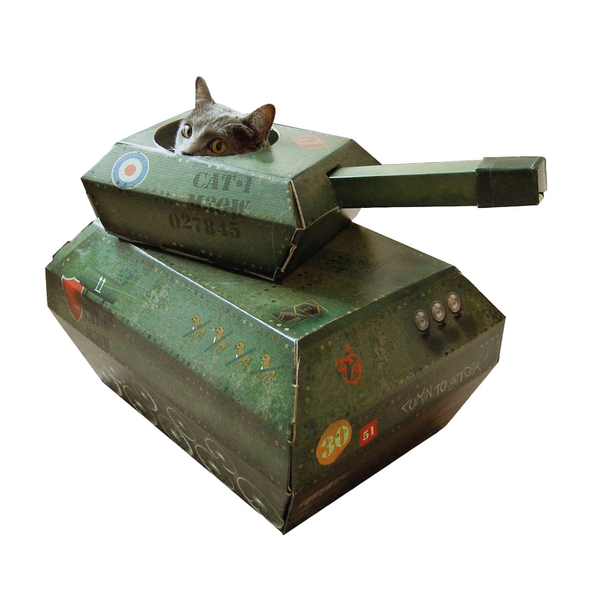 段ボールや箱の中で遊ぶのが大好きな猫ちゃん。この段ボール戦車は、遊んだり隠れたり、遊び心満載のキャットハウスです。