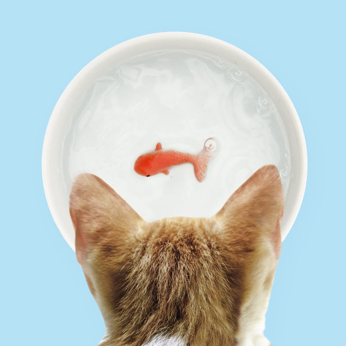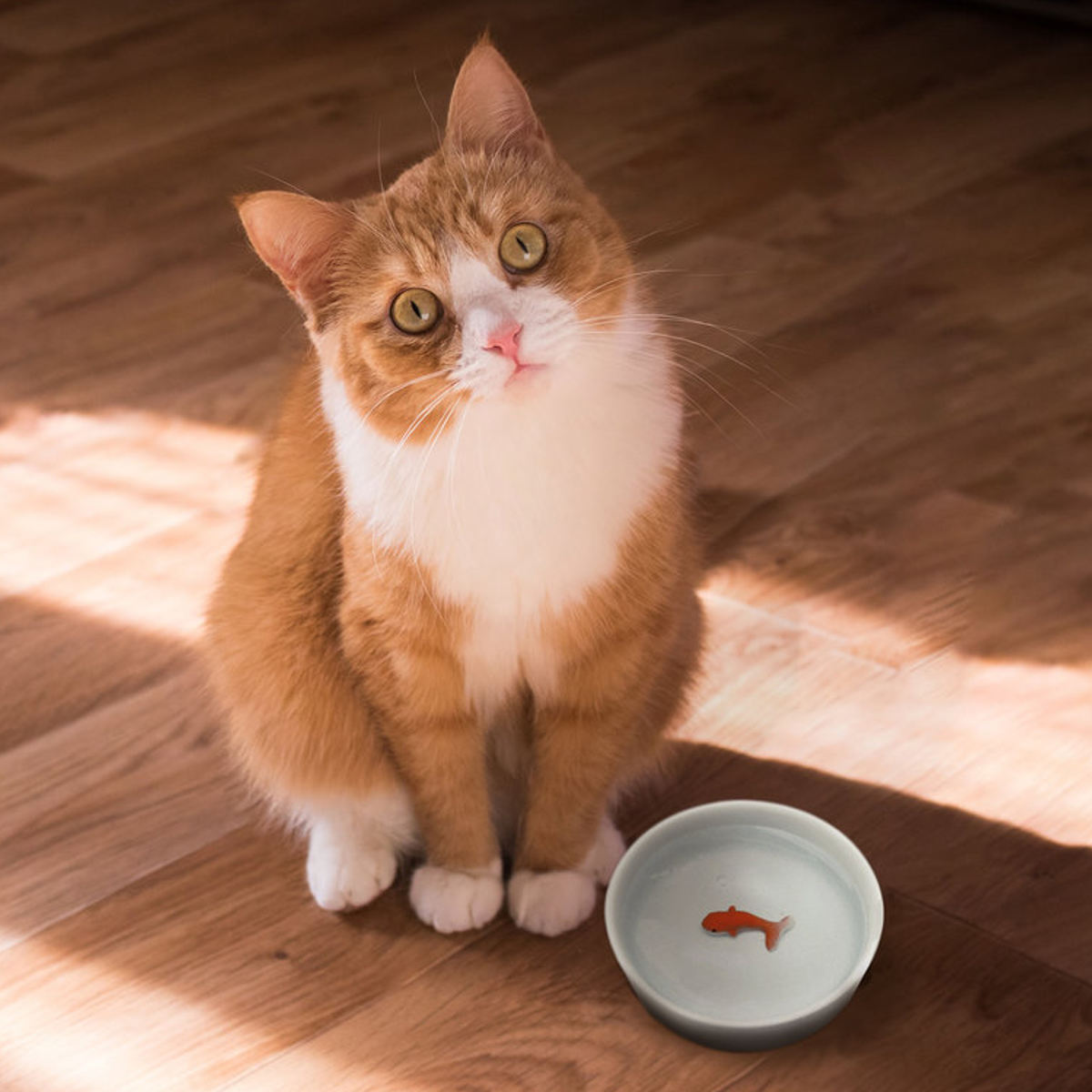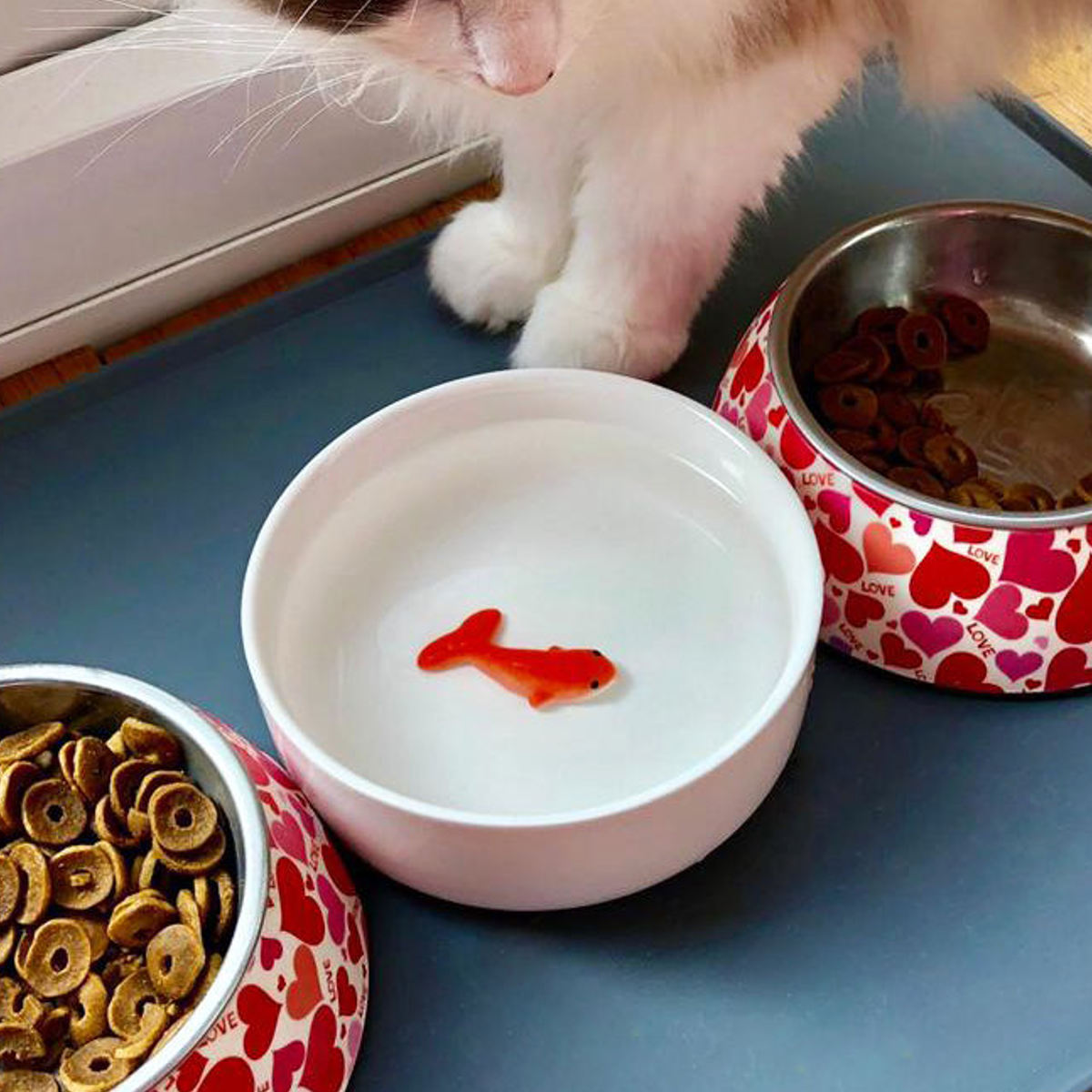 ボウルの底に金魚が描かれたフードボウルです。水を入れればまるで金魚が泳いでいるよう。金魚を捕えようと、夢中になって水を飲む猫ちゃんの姿がかわいいです。