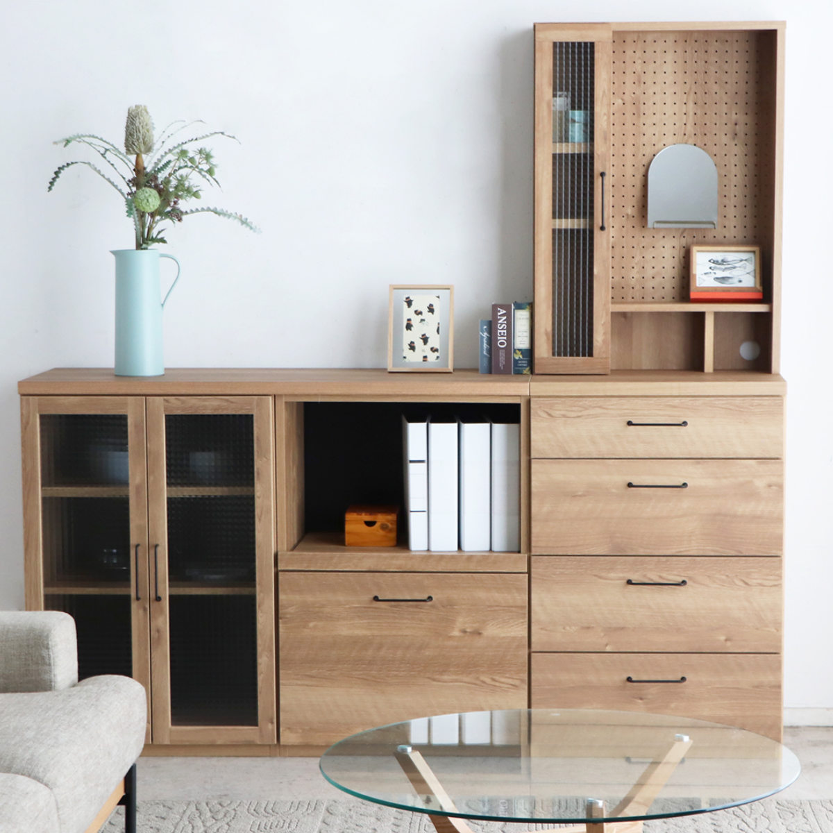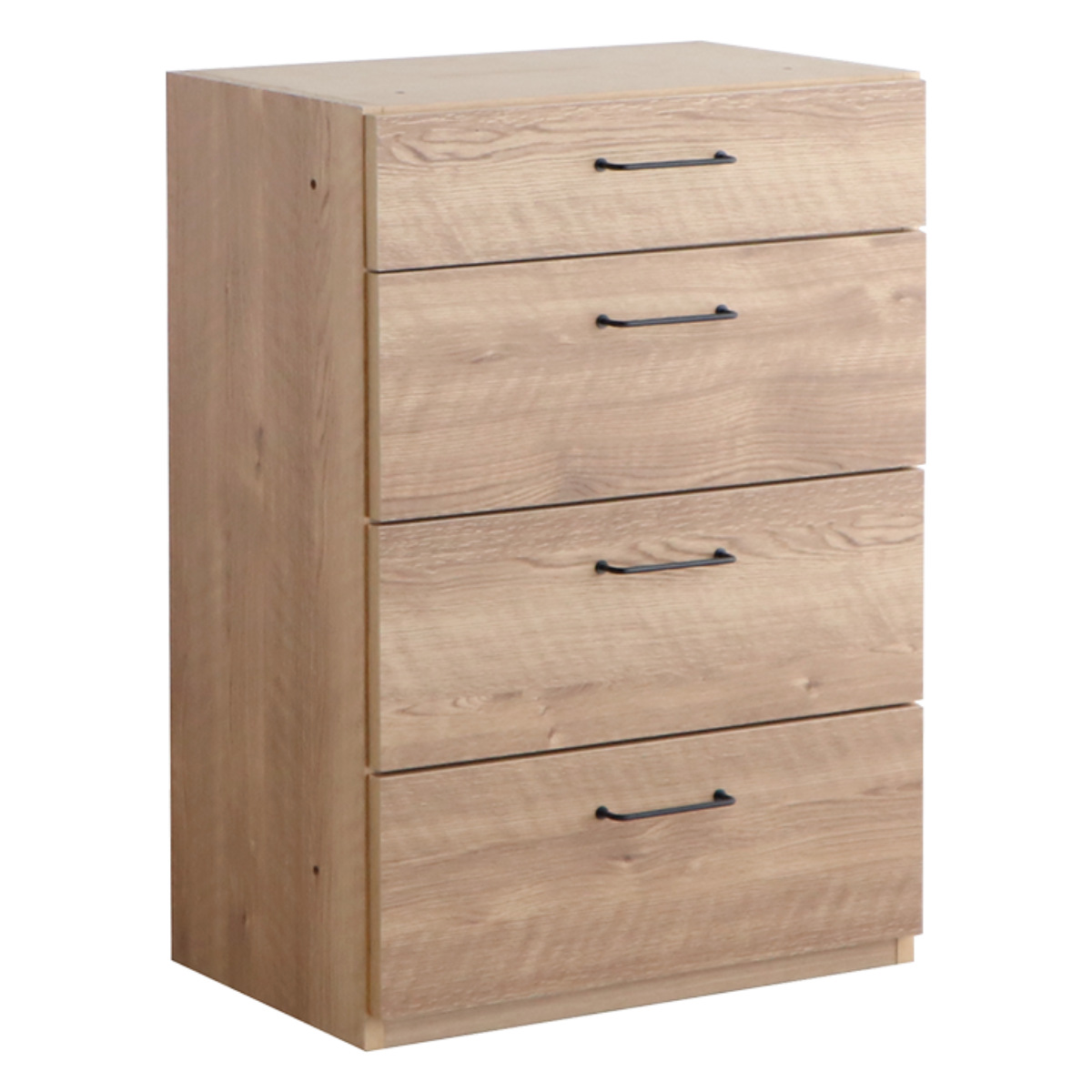 幅59.8cm×高さ87cmの規格サイズで統一した組み合わせができるカスタム収納、トラクトシリーズの4段チェストです。上下に積み重ねたり、横並びにしたり、暮らしに合わせたあなただけのオリジナル収納が完成します。天然木のような質感が、ナチュラルで清潔感のある印象に仕上げています。
