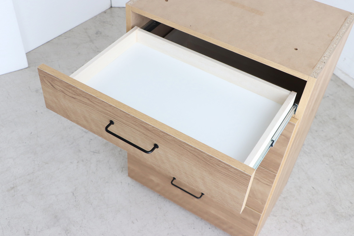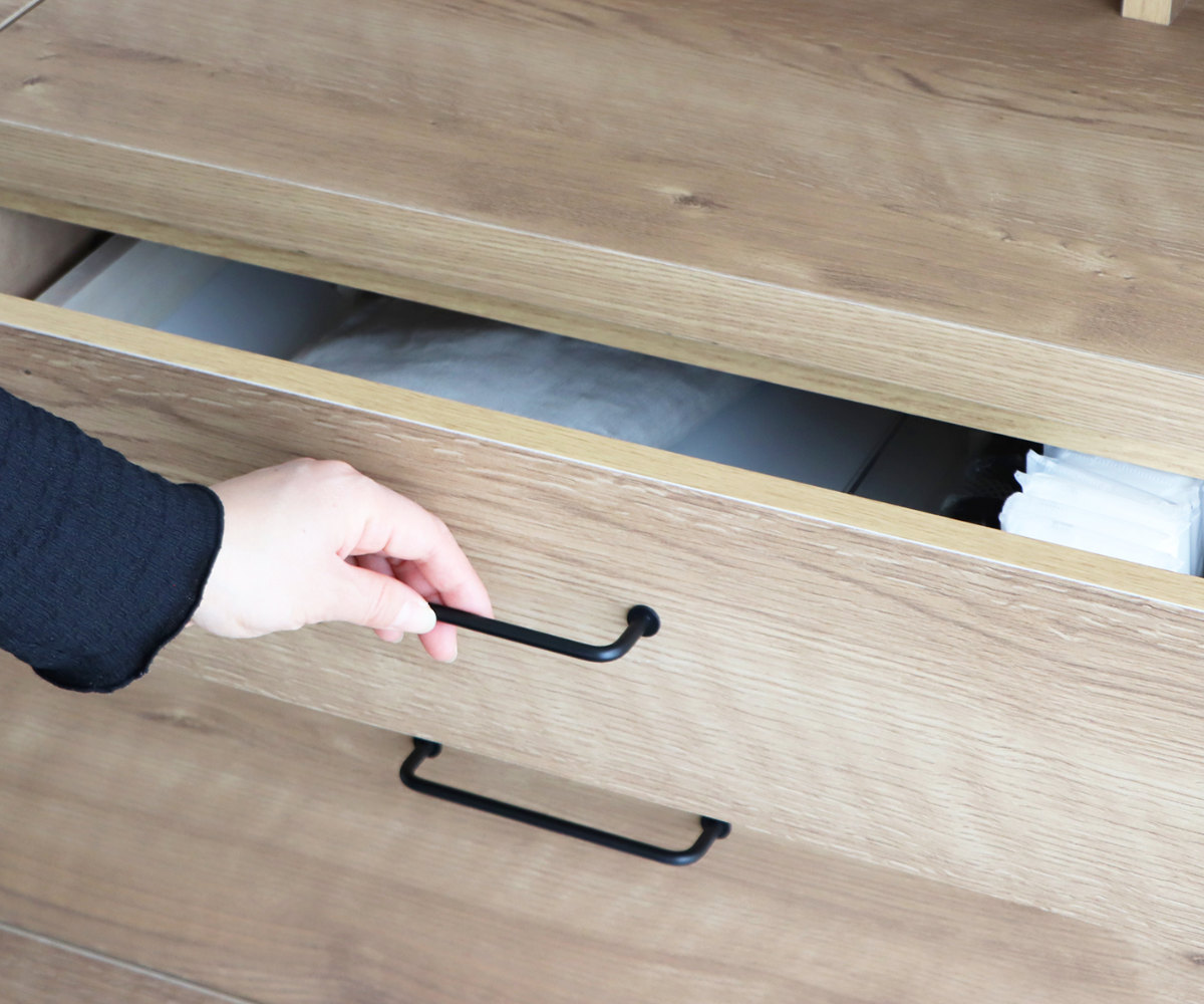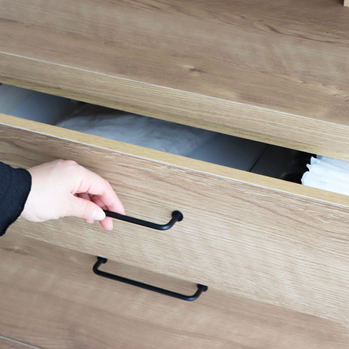 引出しの取っ手は、細身のアイアンで掴みやすいです。フルスライドレール仕様で、軽い力で手前までしっかり引き出すことができます。フルオープンの引出しは、中を上から見渡せるので整理がしやすく、探しやすいです。食器やカトラリー、デスク周りの小物など、様々なものを収納できます。