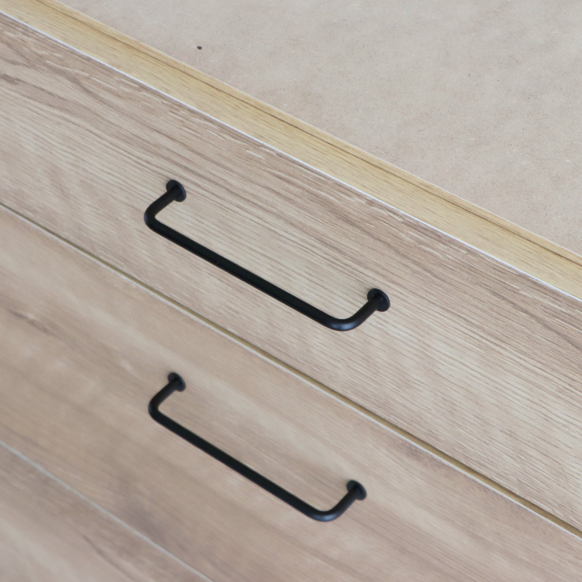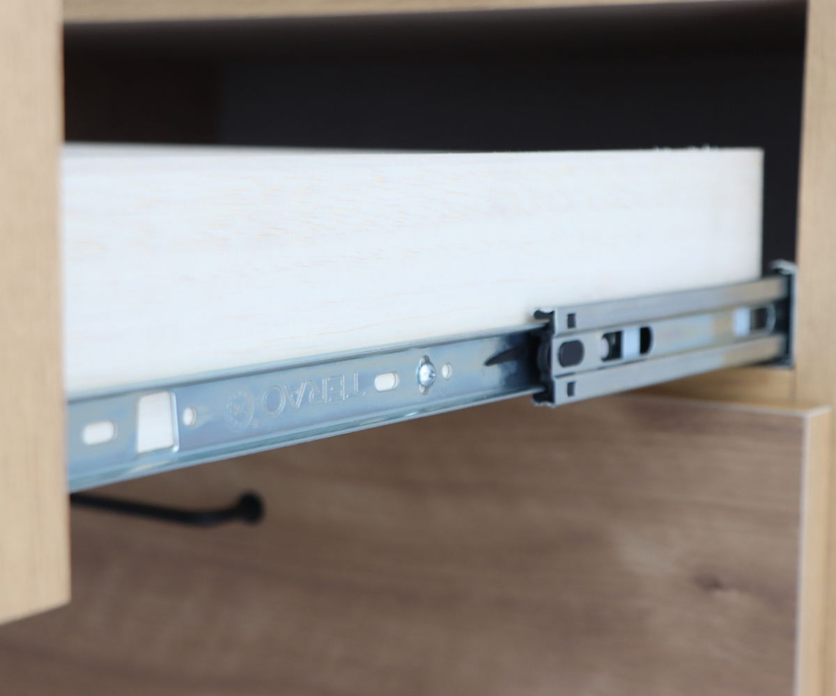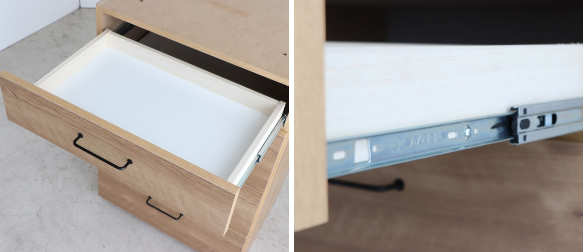 引出しの取っ手は、細身のアイアンで掴みやすいです。フルスライドレール仕様で、軽い力で手前までしっかり引き出すことができます。フルオープンの引出しは、中を上から見渡せるので整理がしやすく、探しやすいです。食器やカトラリー、デスク周りの小物など、様々なものを収納できます。