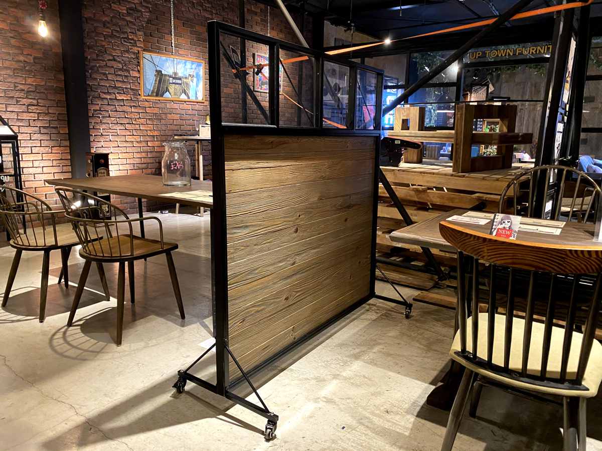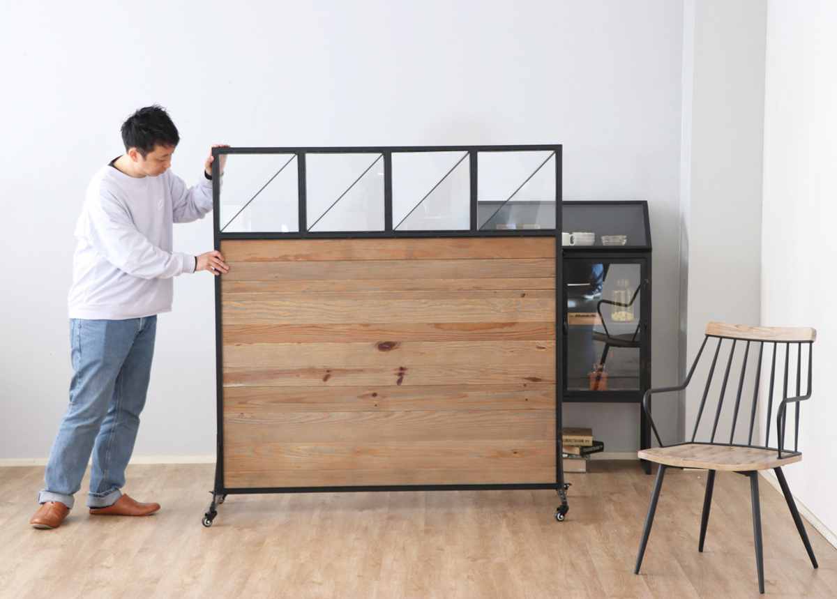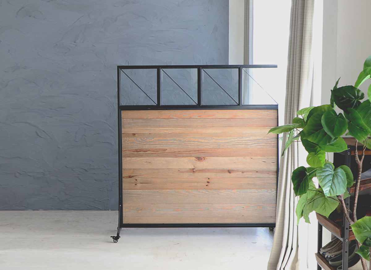 温かみのある古材の雰囲気をブラックスチールで引き締めたデザイン。カフェや美容室などでも、雰囲気を損なわずに目隠しができます。