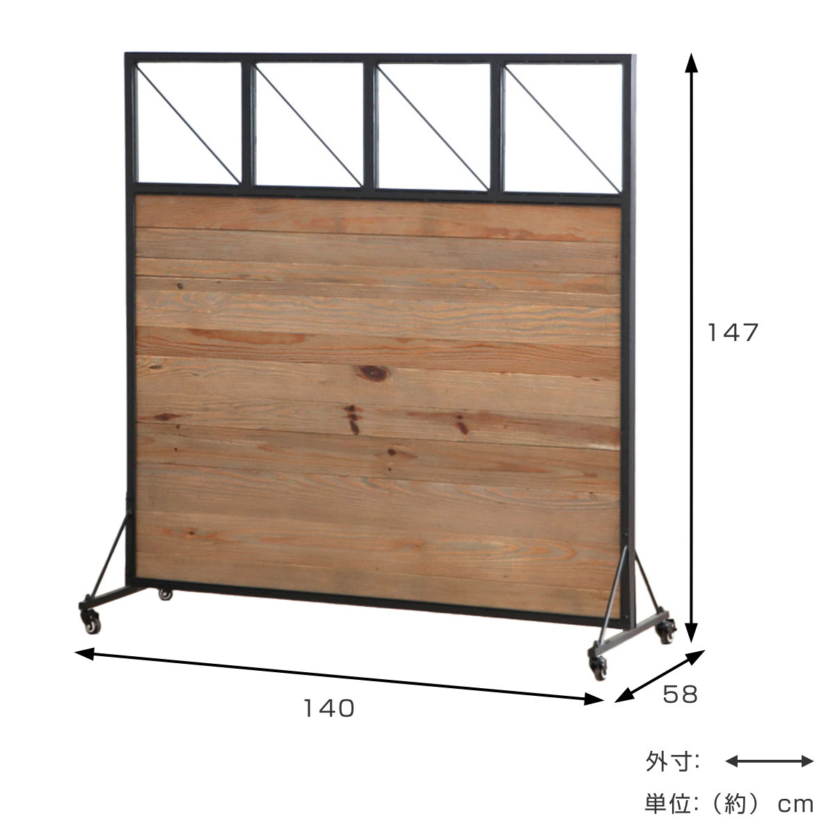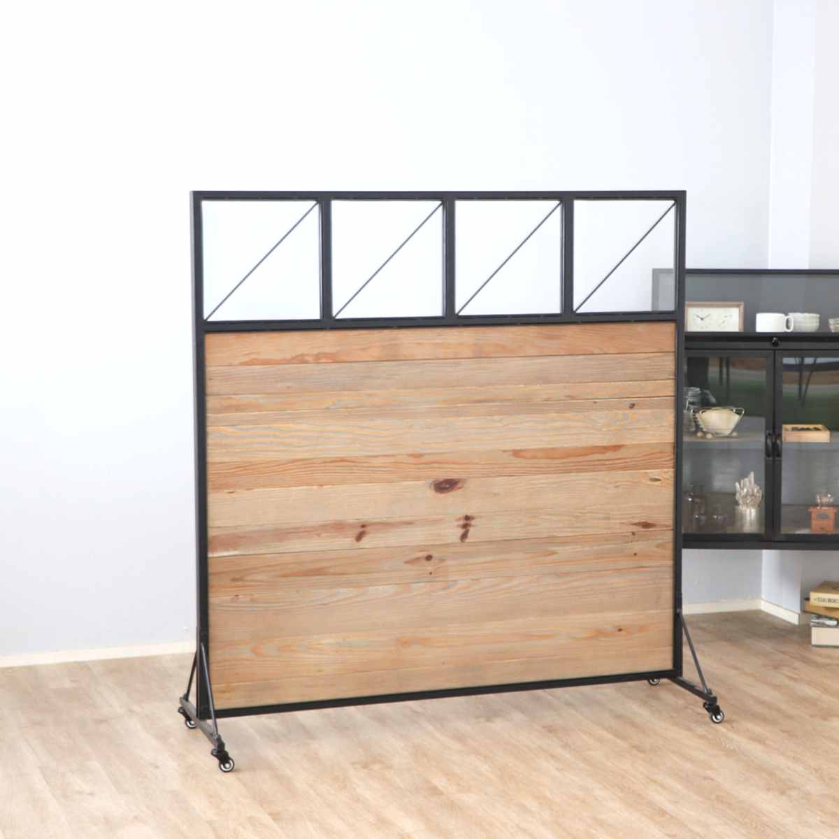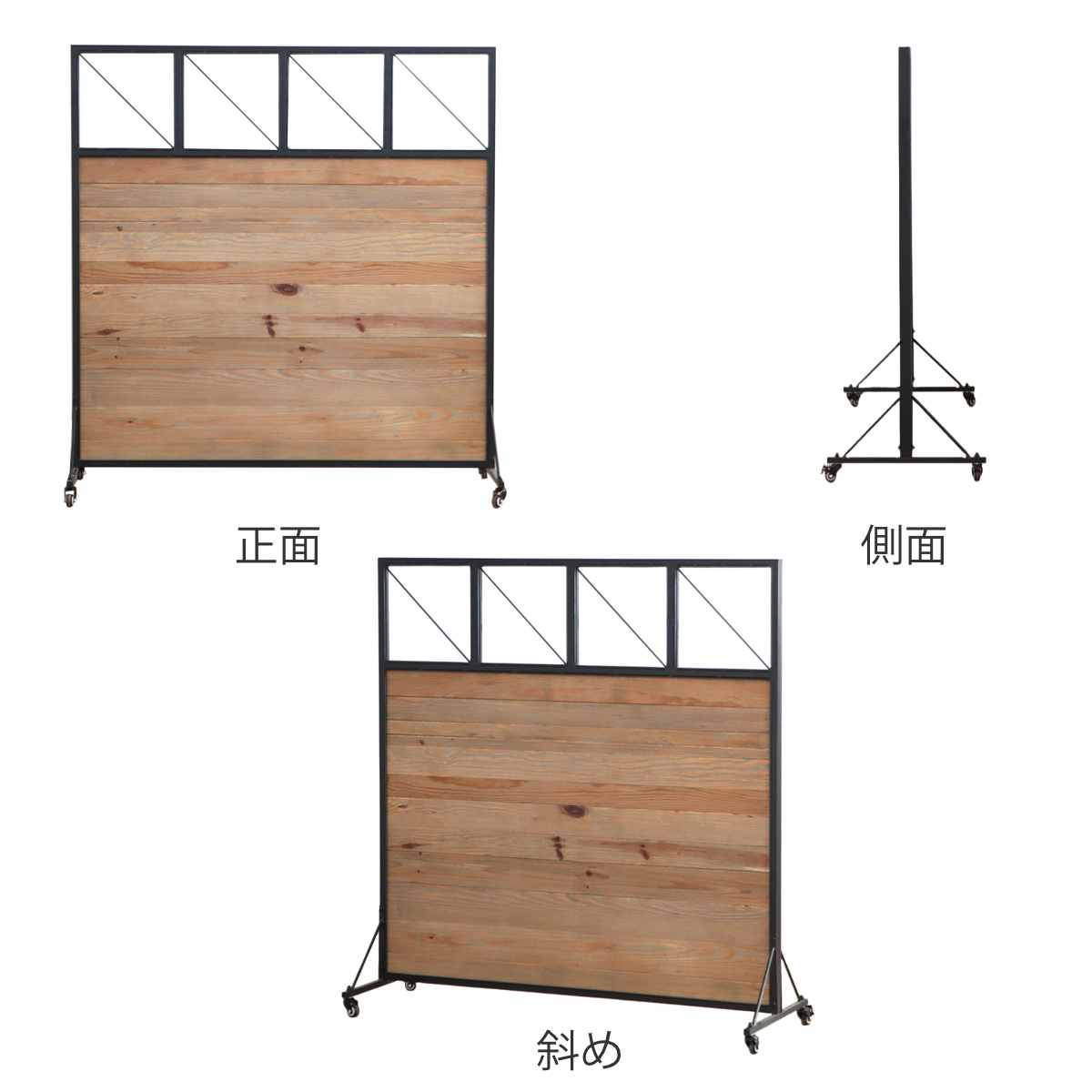 温かみのある古材の雰囲気をブラックスチールで引き締めたデザイン。カフェや美容室などでも、雰囲気を損なわずに目隠しができます。