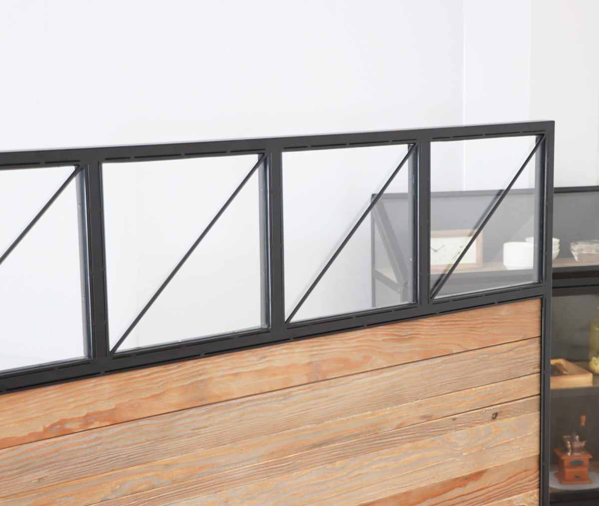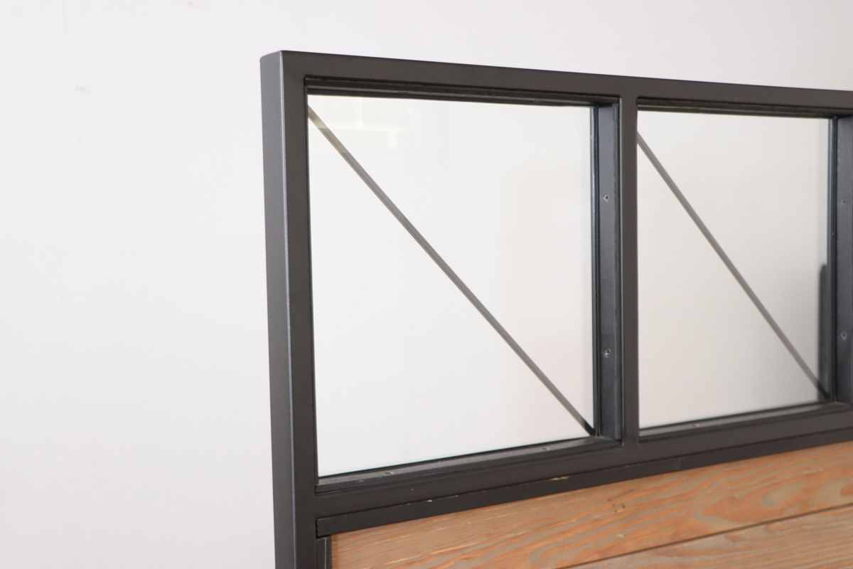 上部はガラスで程よく抜け感があります。スタイリッシュな印象の斜めのスチールは、輸送時の破損防止にも一役買っています。