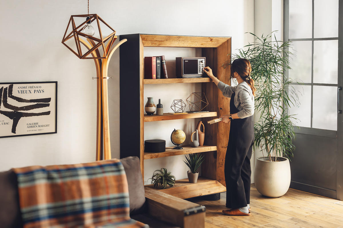 サイズちがいのシェルフや同じシリーズを並べて使うと収納力がアップし、統一感のある空間ができあがります。