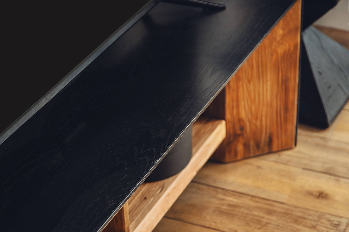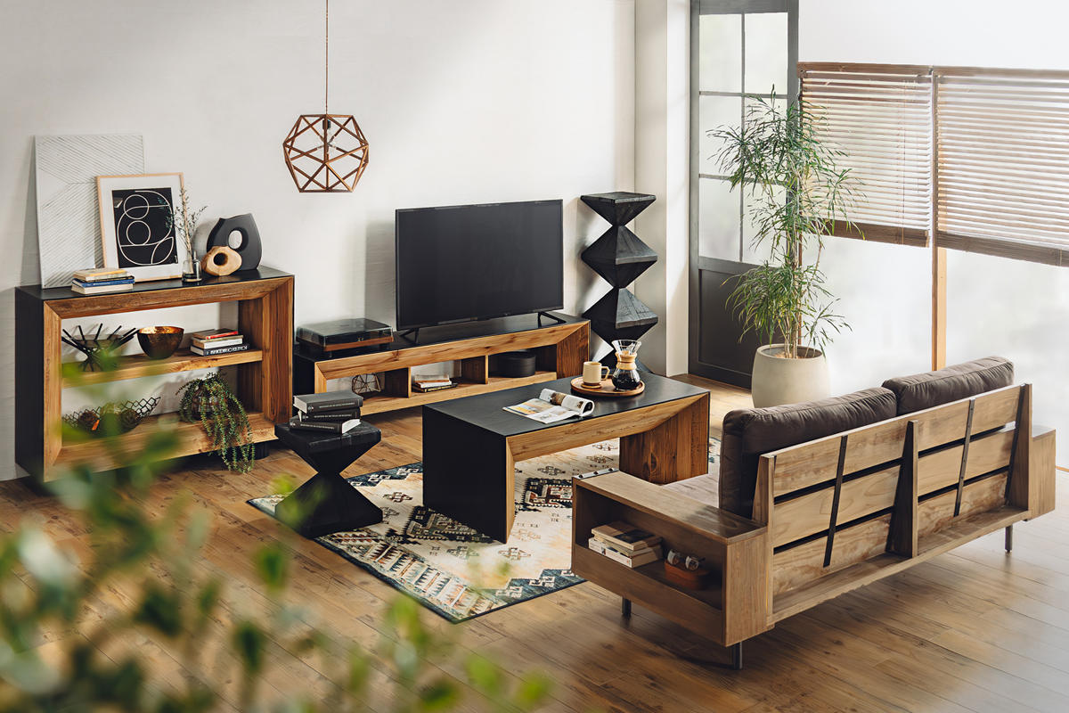 天板と側板は空間を引き締めるブラックで統一。木の温もりと美しく調和し、洗練されたコントラストが空間にほどよいメリハリを与えます。