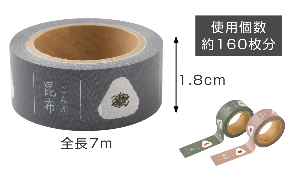 テープにはおにぎりの具のイラストが描かれているので何の具か一目でわかるようになります。テープの種類は「梅・おかか・昆布・鮭・たらこ・ツナマヨ・フリー」の7種類です。今日はどのおにぎりを作りましょう?