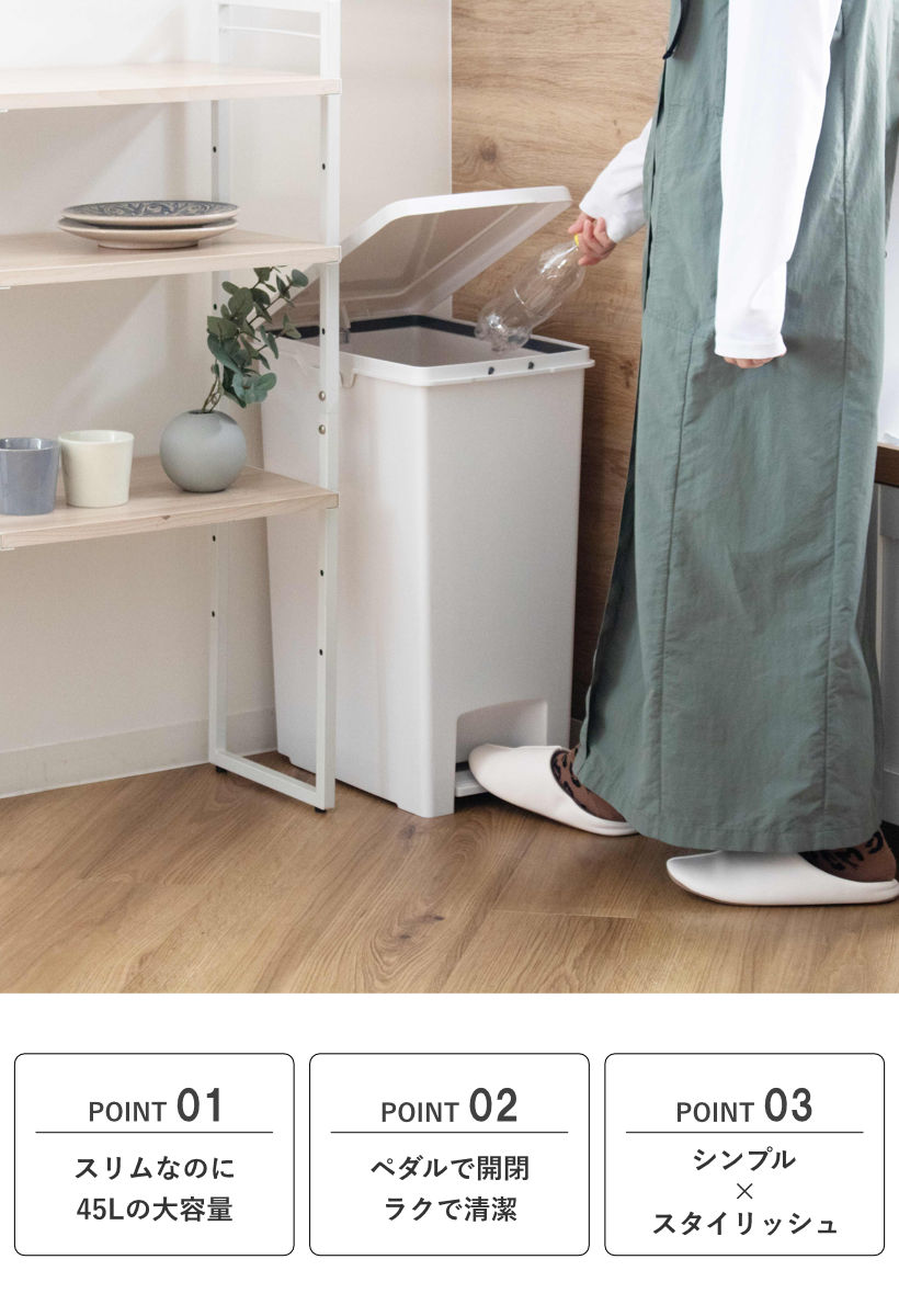 コンパクトなボディながら、45Lの大容量でたっぷり入ります。ゴミ箱がすぐにいっぱいにならず、ゴミ袋を何度も取り替える手間がありません。