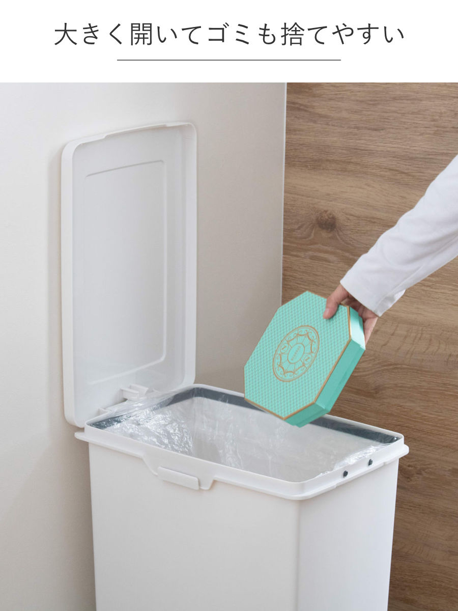 簡単に大きく開くふたで、ピザの空き箱や牛乳パックなどのかさばるゴミもスムーズに捨てられます。料理中の野菜くずや子育て世帯での使用済みオムツなども片手でラクに処理できます。
