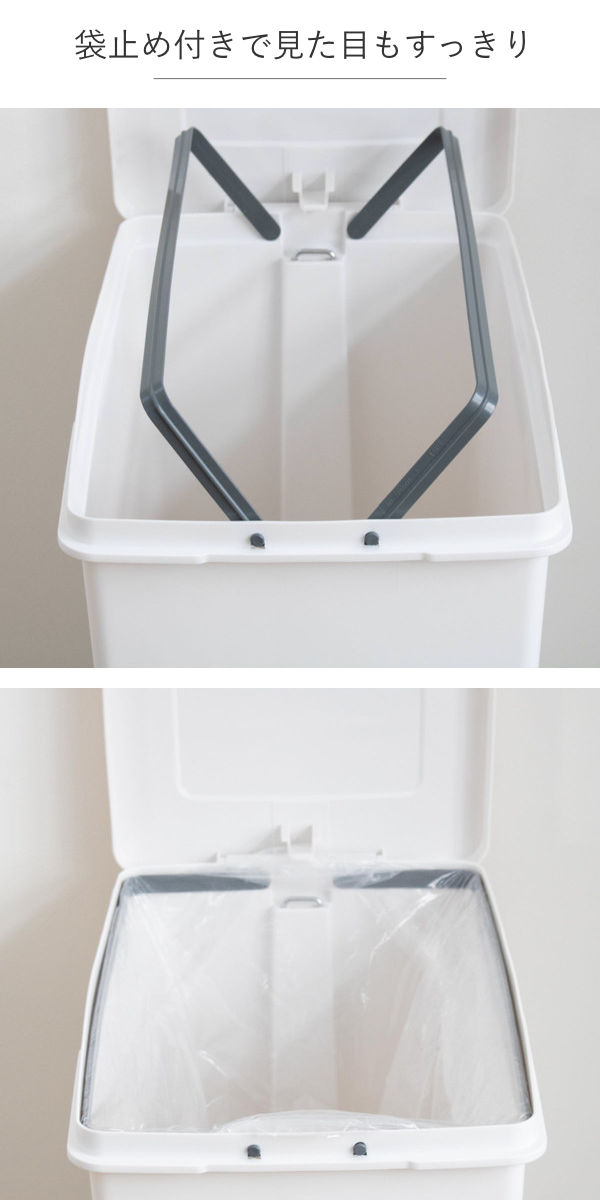 ゴミ袋をしっかりと固定できる袋止めが付いています。袋が内部に落ち込んでしまう心配がなく、快適にゴミを捨てられます。また、袋が外側から見えない仕様のため、見た目もすっきりと美しくお使いいただけます。