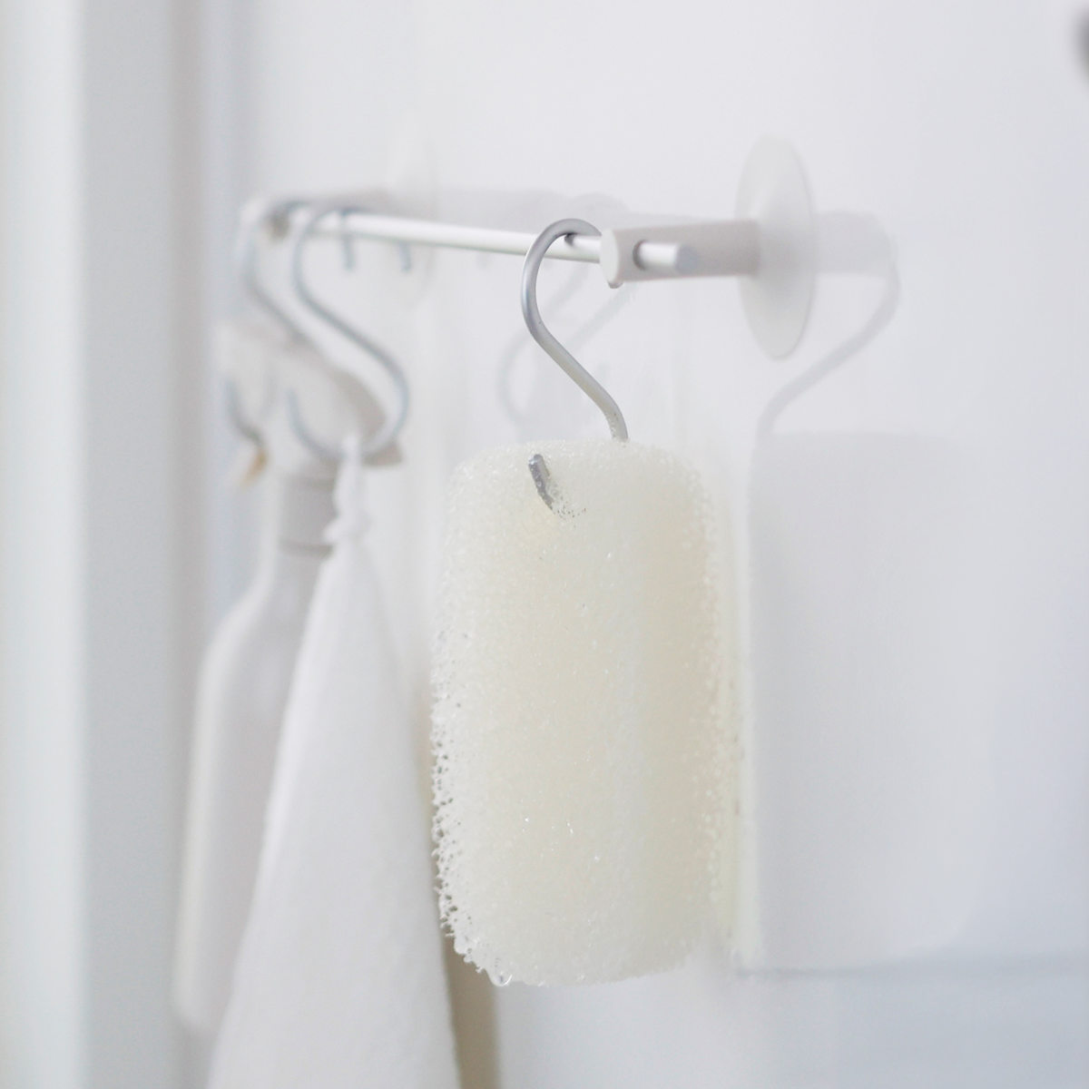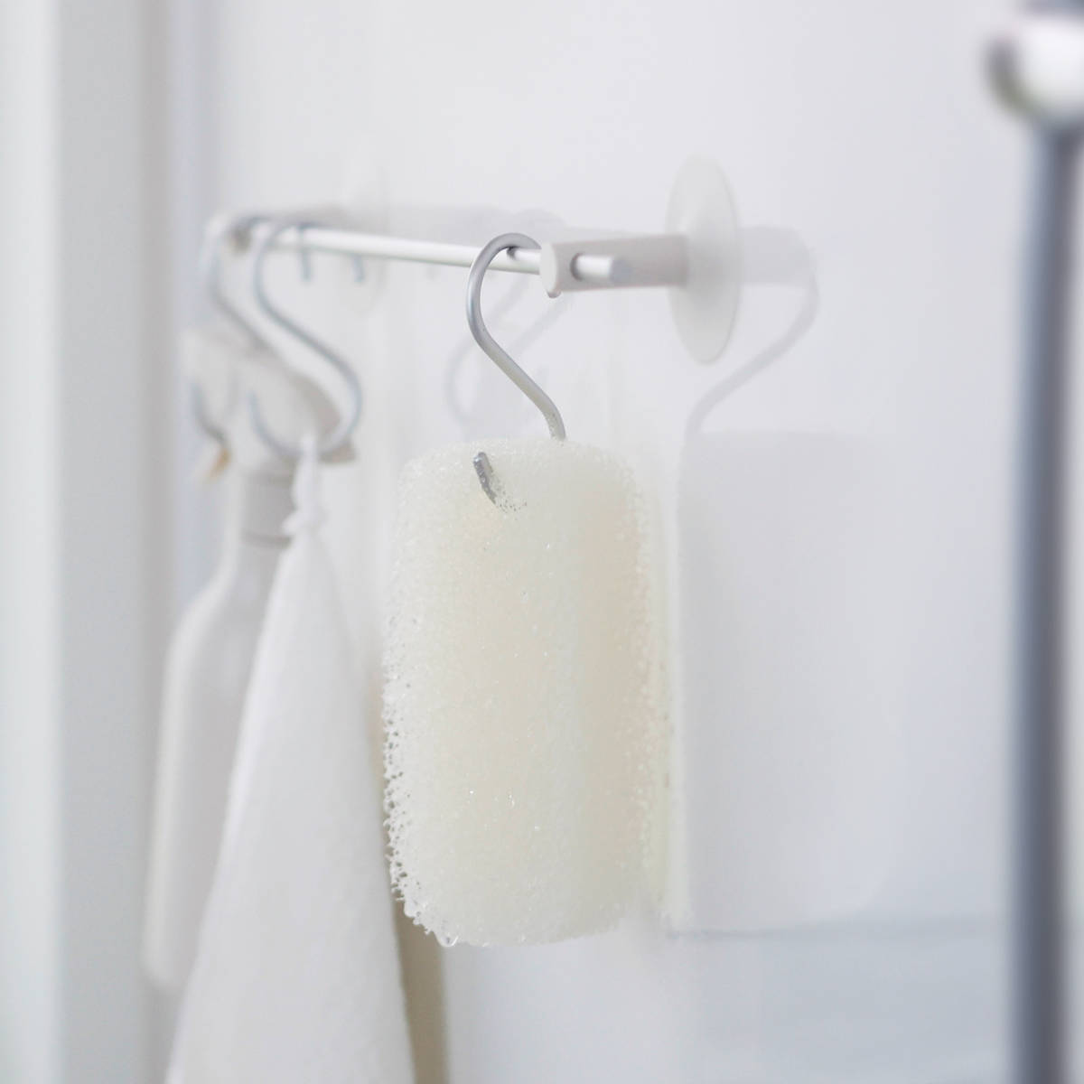 穴付きなので、S字フックなどに掛けて収納できます。スリムなのでバスグッズと一緒に掛けても邪魔になりません。