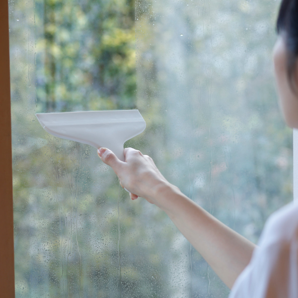 浴室の鏡や壁面を軽い力でサッと水切りできるスキージーです。縦横どちらにも動かしやすく、リビングなどの窓掃除にも使える便利なアイテムです。