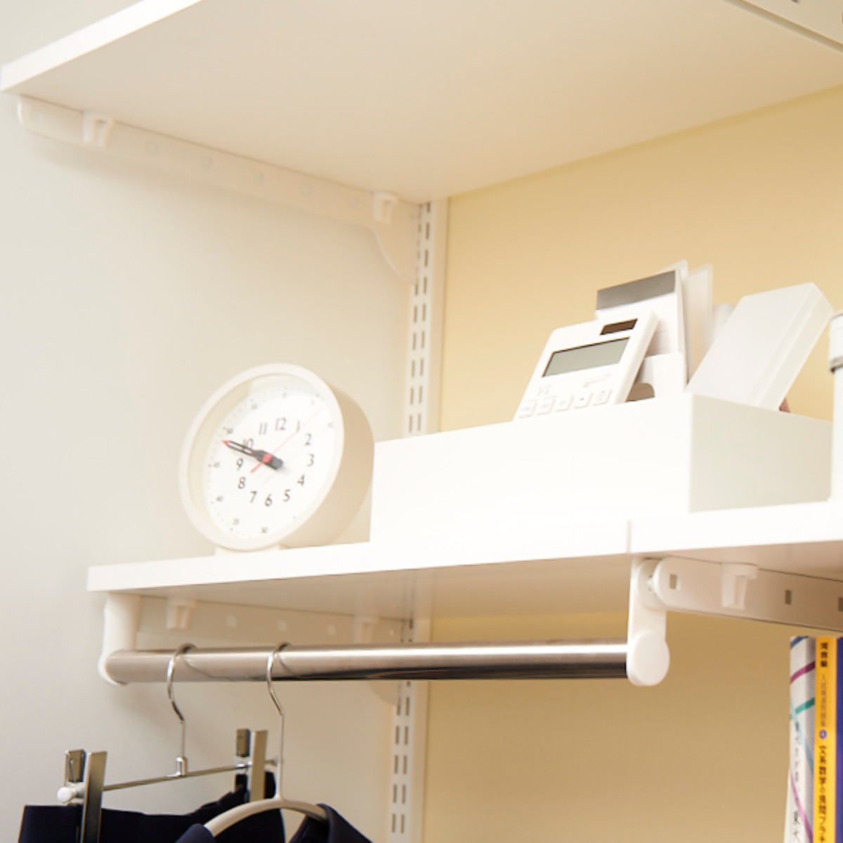 書斎や勉強机の横に設置すれば、棚には教科書や通勤・通学バッグを、パイプにはスーツや制服を引っ掛けて、仕事や学校関連のアイテムを整頓できます。日常生活でよく使うアイテムの定位置を作ることで、取り出しやすく片付けやすい環境が整います。