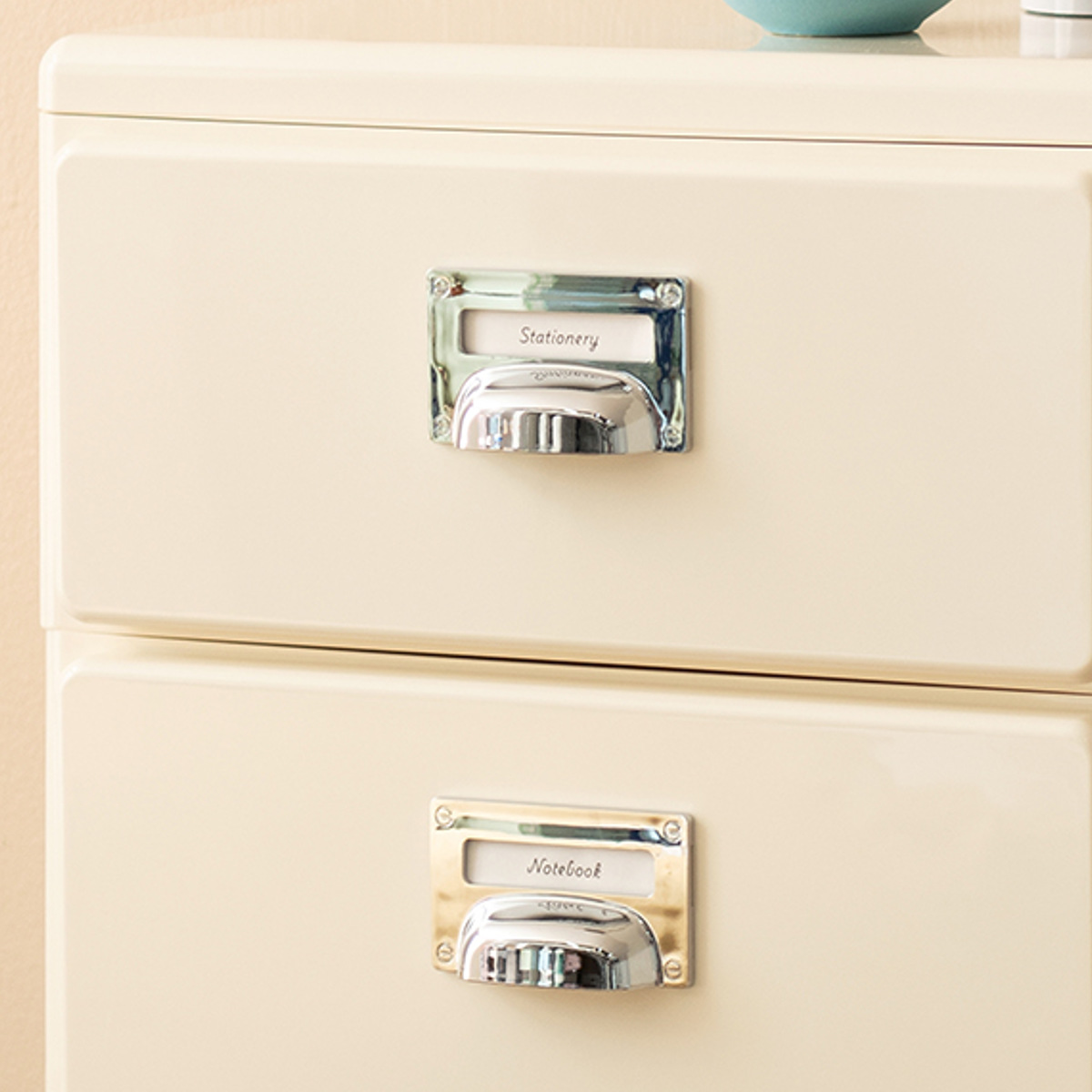 引き出しの取っ手中央にはネームタグがセットできるようになっており、何を収納したかが分かって便利です。取っ手右手側からセットできます。