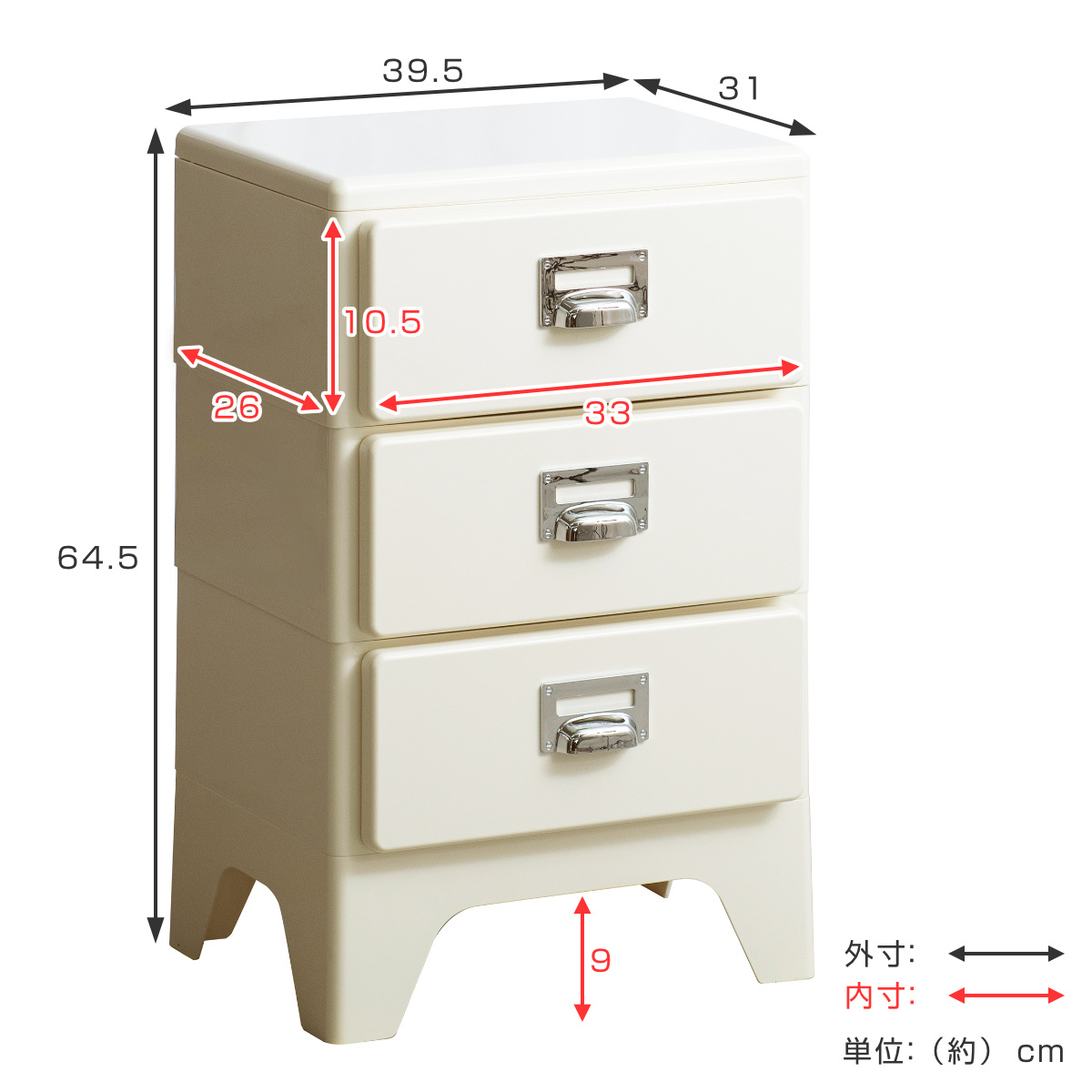| サイズ | 約 幅39.5×奥行31×高さ64.5(cm) 1段あたりの引出内寸:約 幅33×奥行26×高さ10.5(cm) |