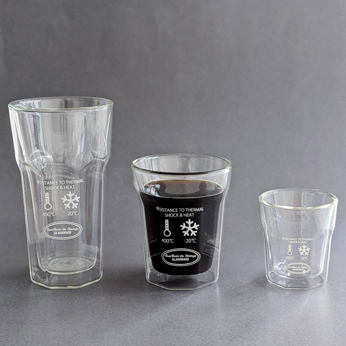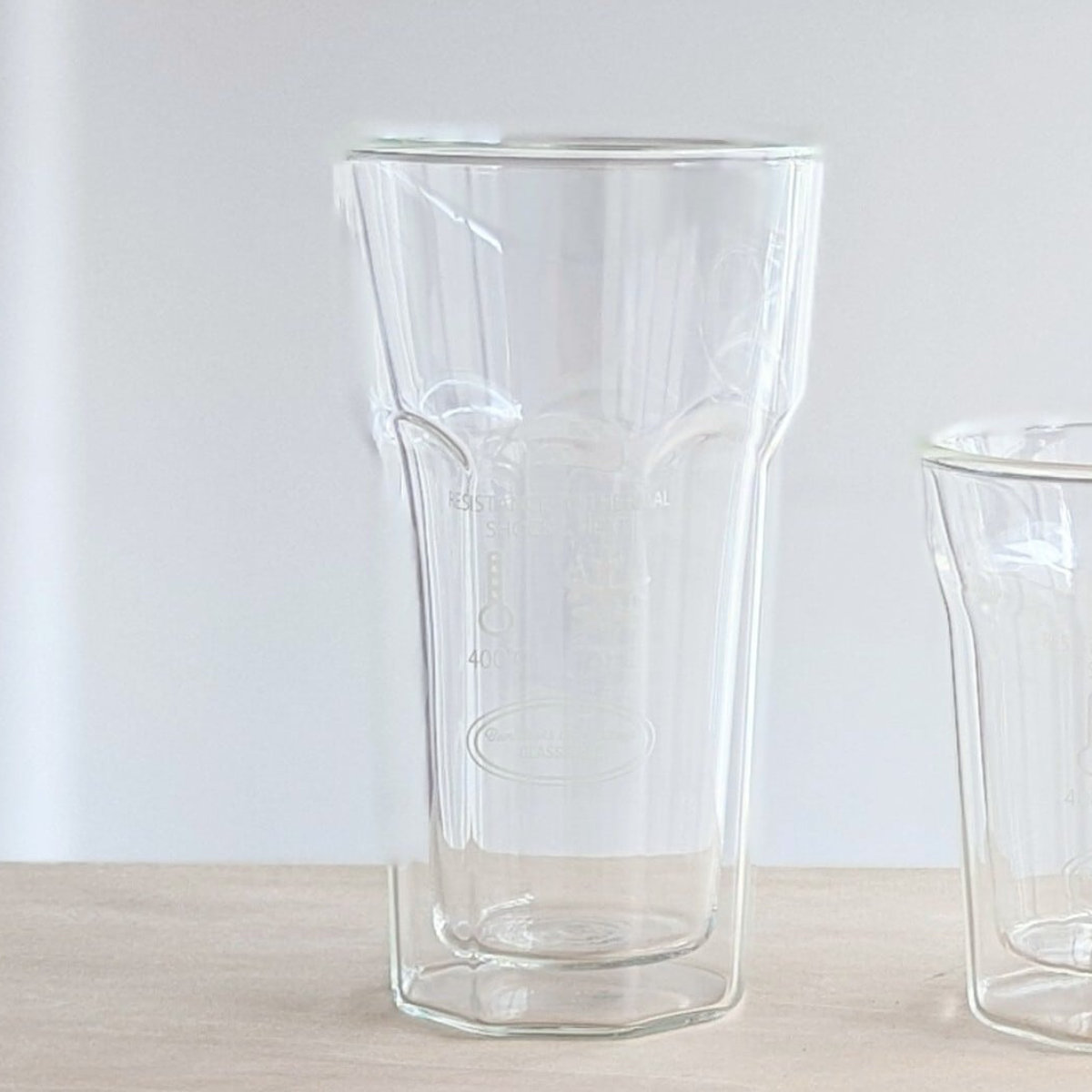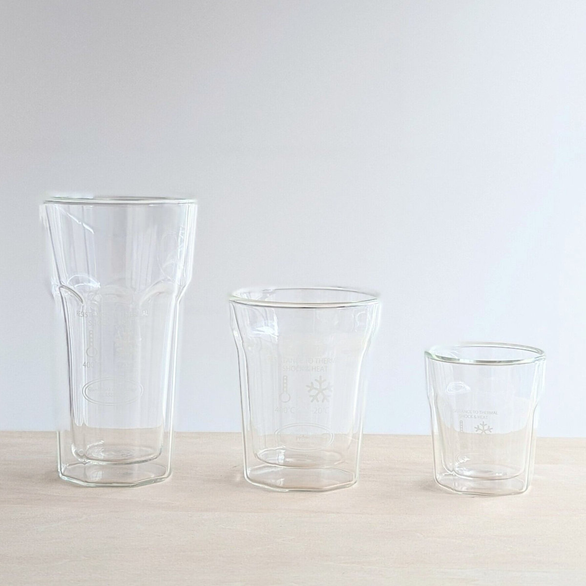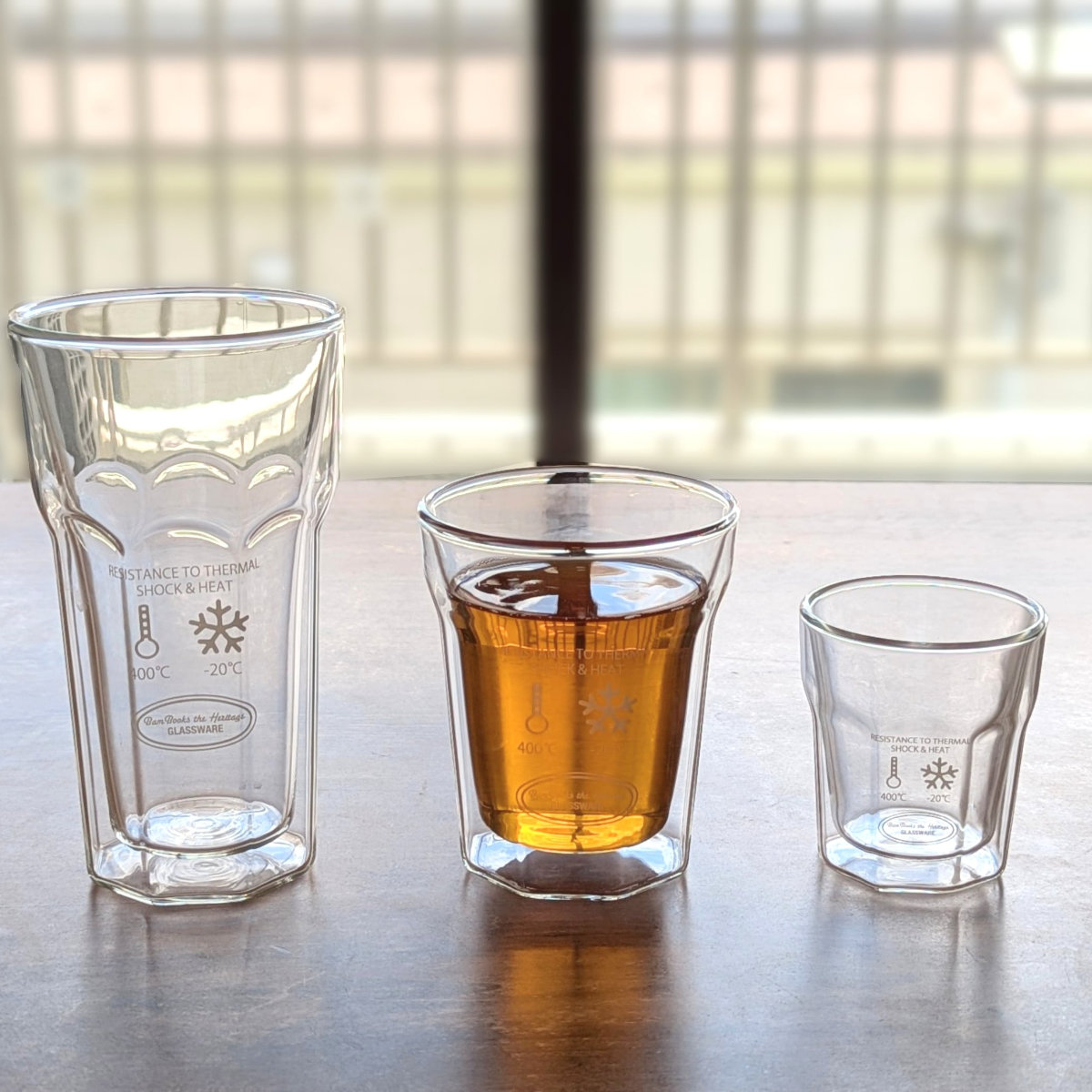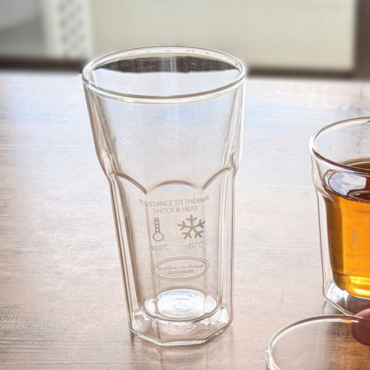 二重ガラス構造により、結露しにくく、外面が熱くなりにくい設計です。冷たいドリンクを注いでもテーブルが濡れにくく、温かい飲み物を入れても持ちやすさを保ちます。