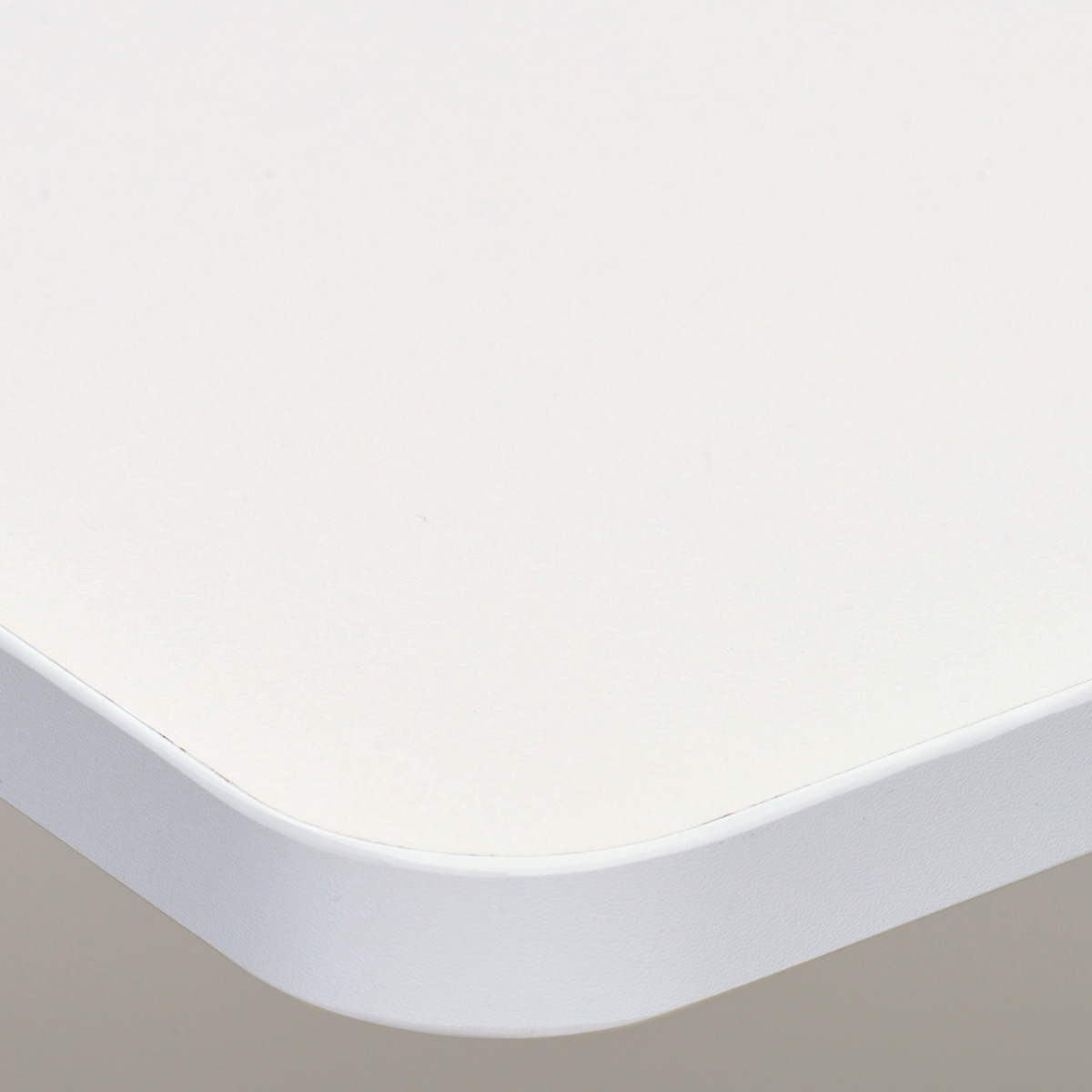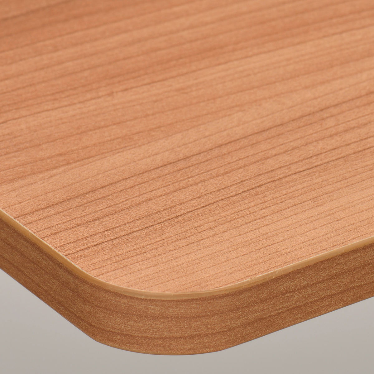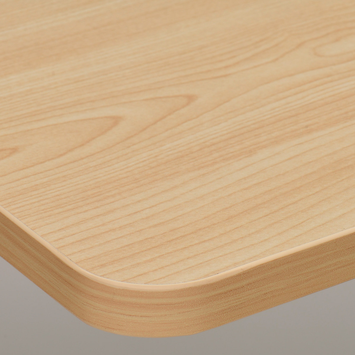 天板はメラミン樹脂を使用した化粧板でできているため、耐久性に優れています。汚れが付きにくく、お手入れがしやすいです。また、角が丸く加工されており安全性に配慮したデザインになっています。