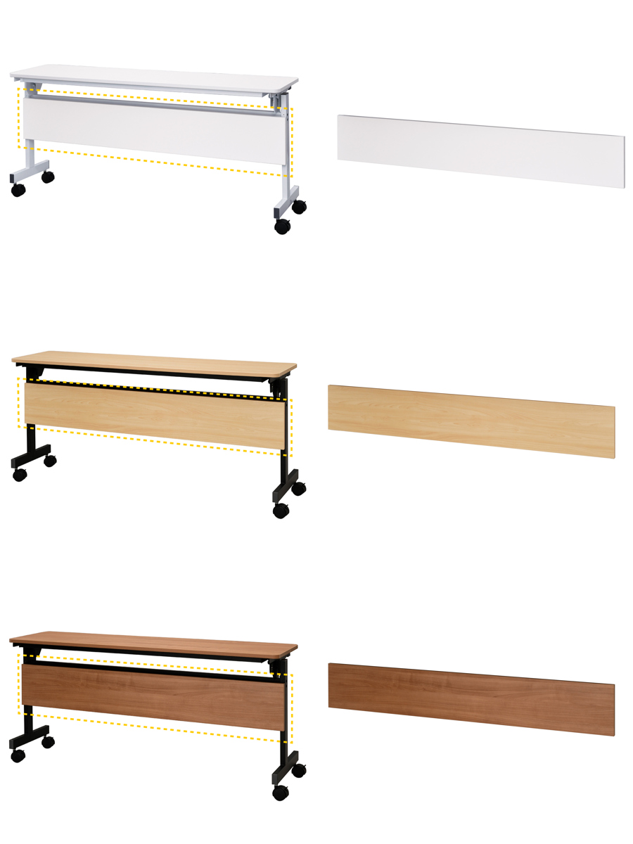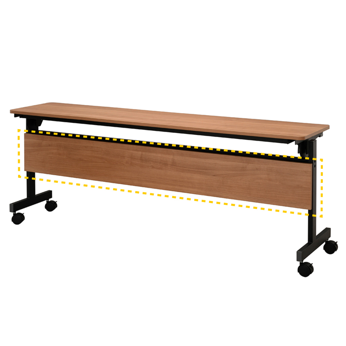 別売りの「シンプルフォールディングテーブル3」幅180cm本体に取り付ける事ができる幕板です。足元をすっきりと隠し、よりスマートな印象に仕上げます。会議室やセミナールーム、研修施設など、フォーマルな空間づくりに最適です。
