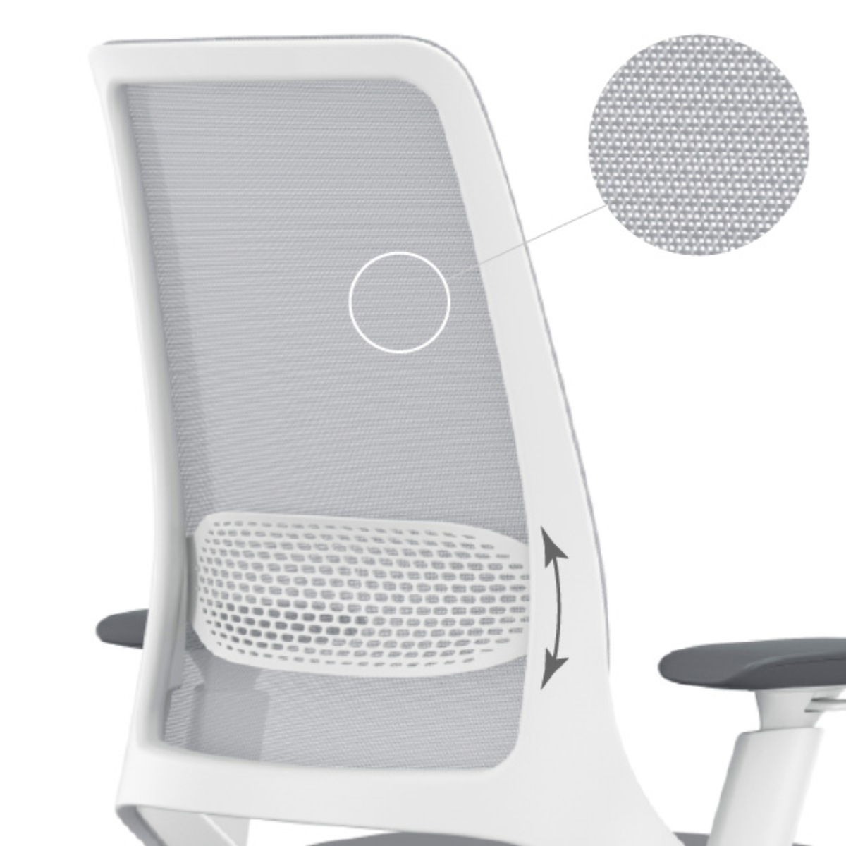 ハグチェアの背もたれは通気性に優れたメッシュ仕上げです。腰部にはランバーサポートを標準装備しており、体格や姿勢に合わせて上下60mm範囲内で位置を調整できます。