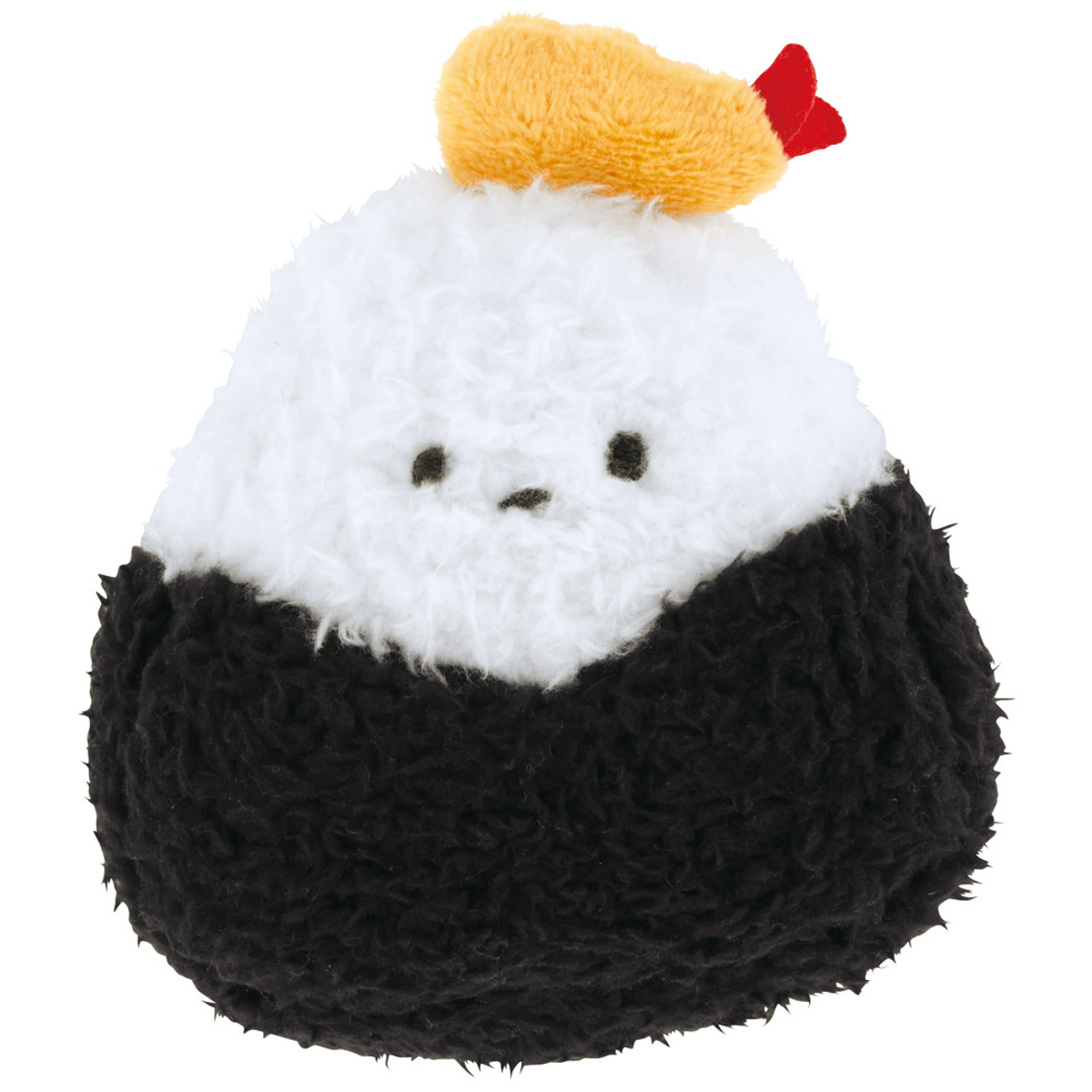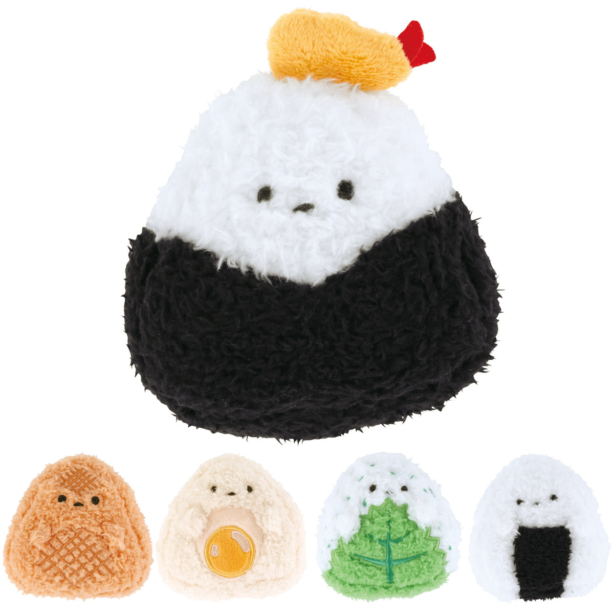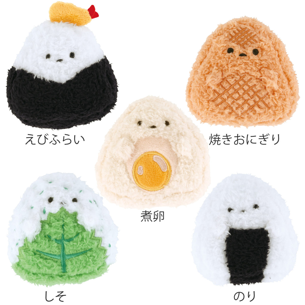 手のひらサイズでふわふわ素材のぬいぐるみです。えびふらい、焼きおにぎり、煮卵、しそ、のり、5種類の具材のおにぎりがあるので、ぜひシリーズで揃えて楽しんでください。