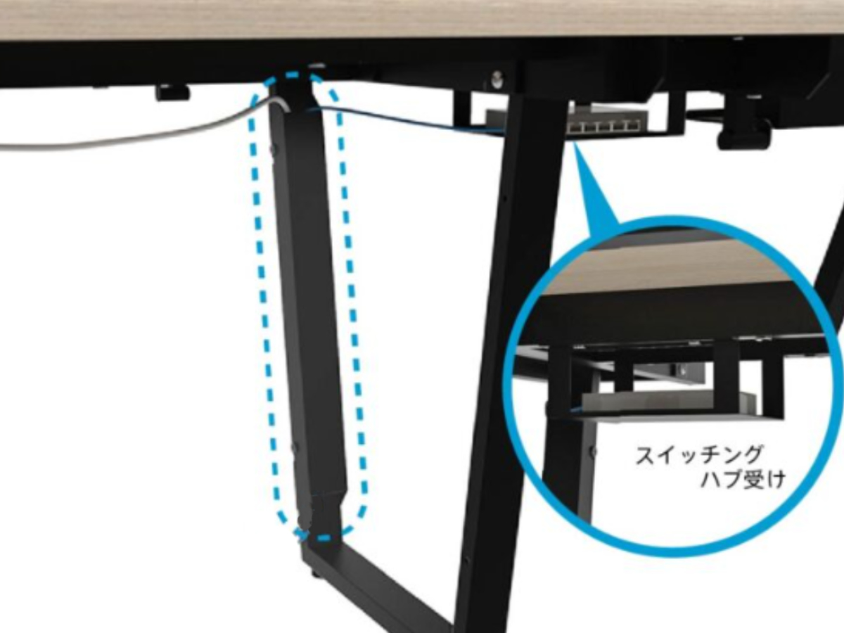 中間脚部に、取り付ける配線カバーとスイッチングハブ受けが付属しており、ケーブル類を脚部に沿わせて、中央部から床面まできれいにまとめられます。