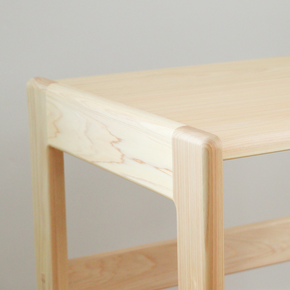 ヒノキの温かみを感じる、柔らかなフォルムが可愛らしいキッズデスクです。明るい色味の木材はインテリアになじみやすく、ナチュラルテイストのお部屋づくりにもぴったりです。