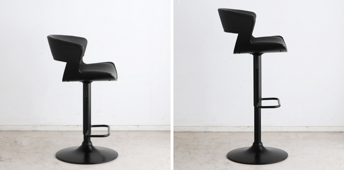 スチール製のブラック脚が全体の印象を引き締めます。また、フットレスト付きなので安定して座ることができ、足の疲れを軽減します。