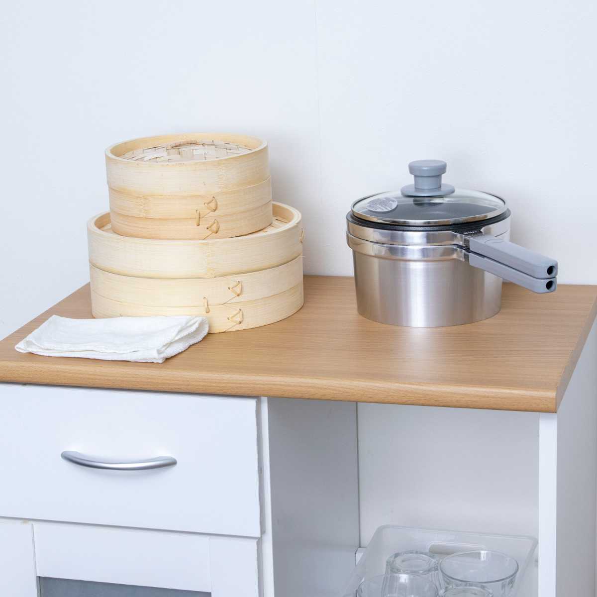 【浅鍋】【深鍋】【ガラス蓋】の組み合わせにより、炊く・蒸す・煮る・茹でる・焼く・炒める・揚げる・オーブン代わりの天火調理まで、ひとつで8通りの調理に対応します。