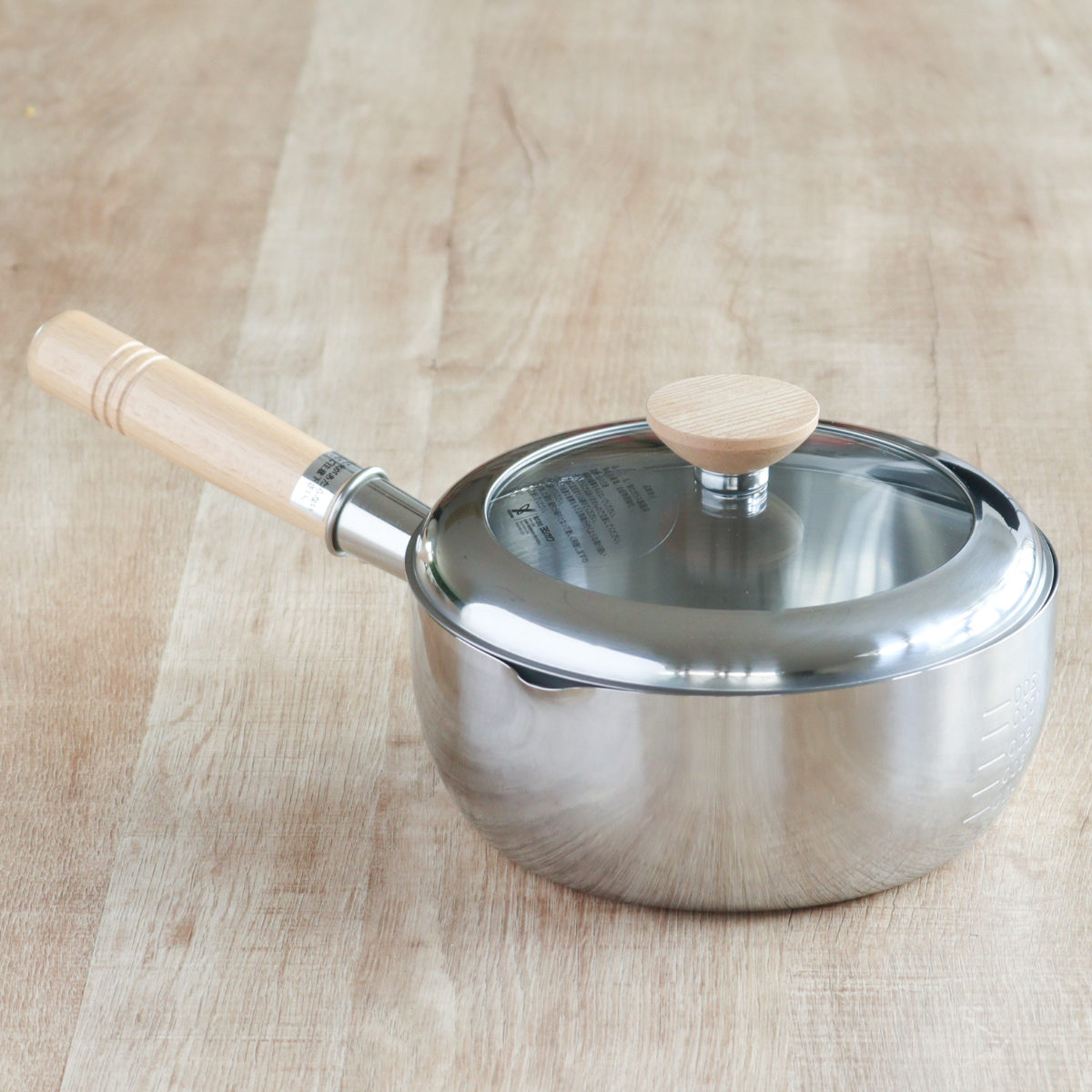 | 材質 | 本体:ステンレス ハンドル:天然木(ウレタン塗装) ガラス蓋:ステンレス、全面物理強化ガラス |