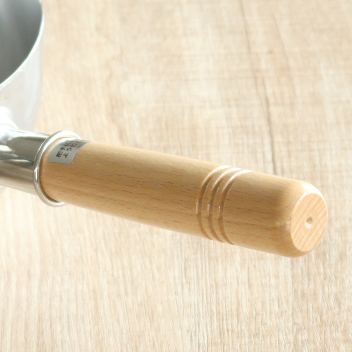手にしっくり馴染む木製のハンドルです。表面にはウレタン塗装が施されており、汚れが染み込みにくく扱いやすいです。