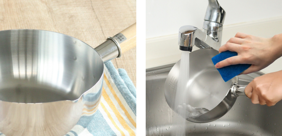 両側に注ぎ口があるので、利き手やキッチンの配置を選ばず、煮物や汁物をスムーズに移せます。