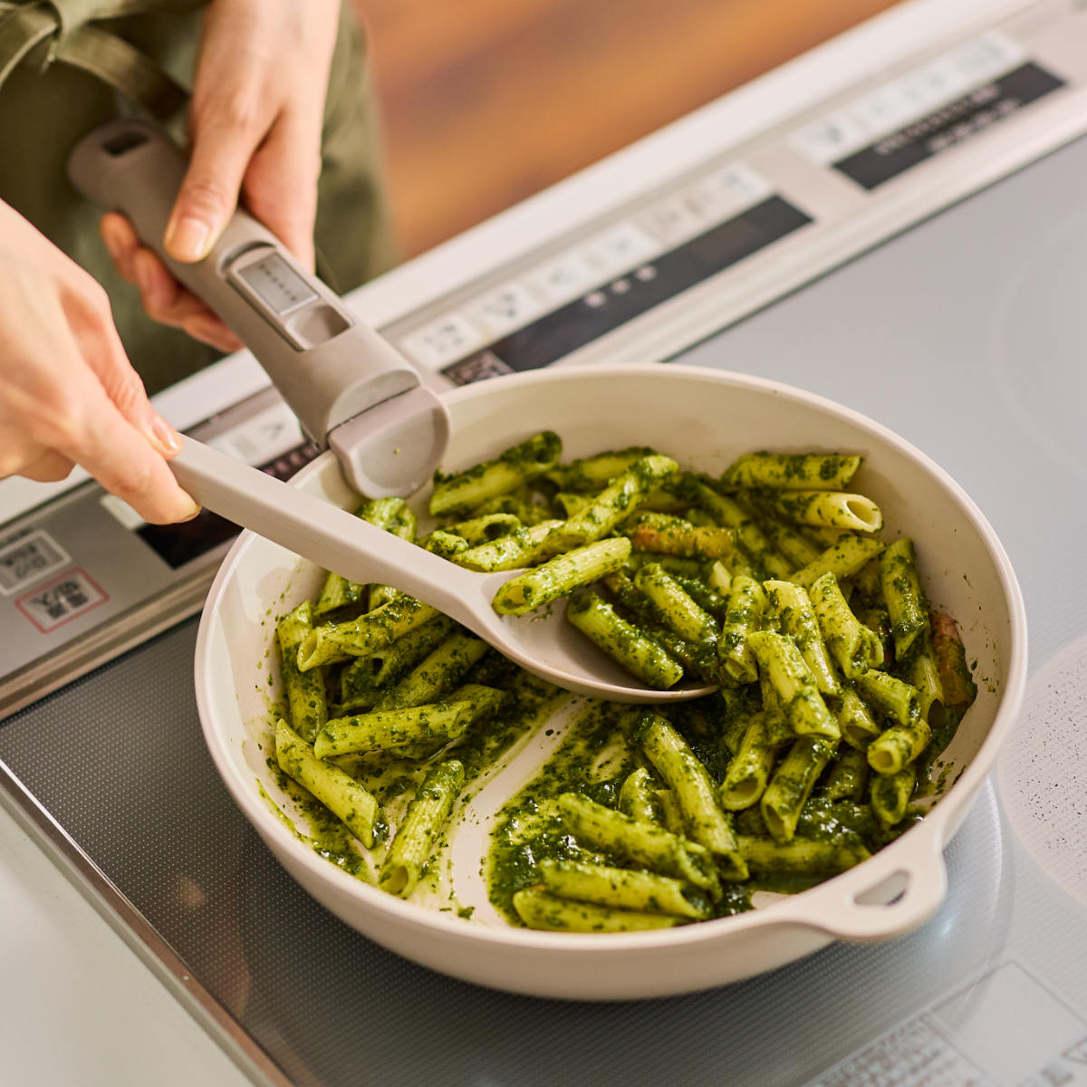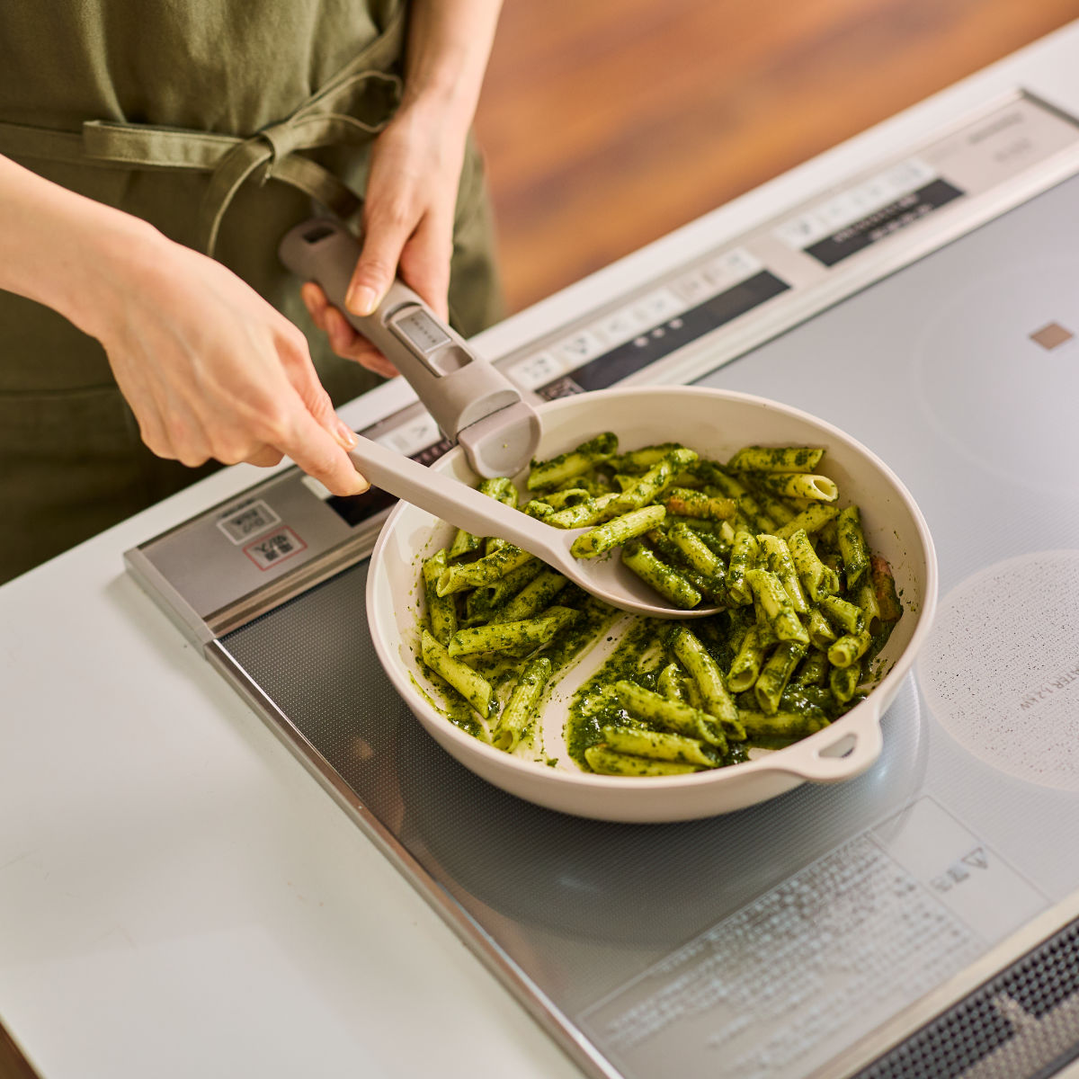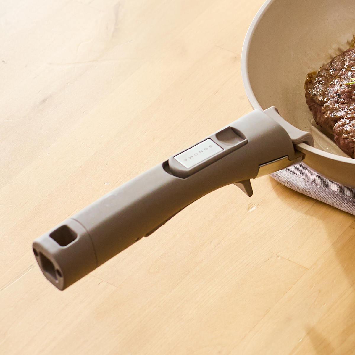ハンドルには別売りの「SONOMA」シリーズのキッチンツールを、マグネットでくっつけられます。キッチンツールをハンドルにつけたまま調理できるので使い勝手が抜群です。立てた状態でも自立する形状です。