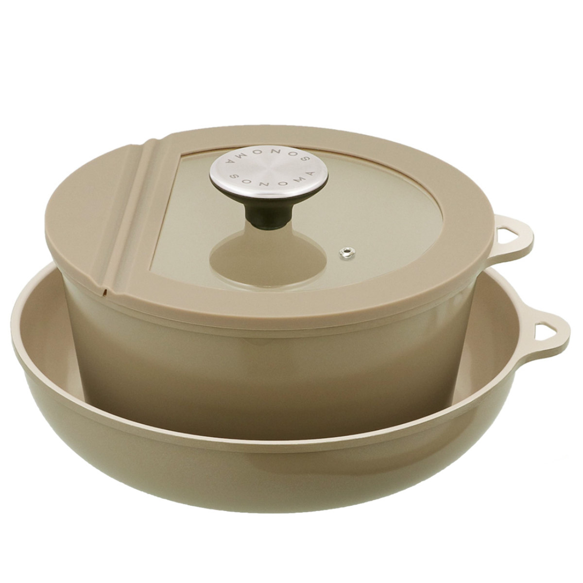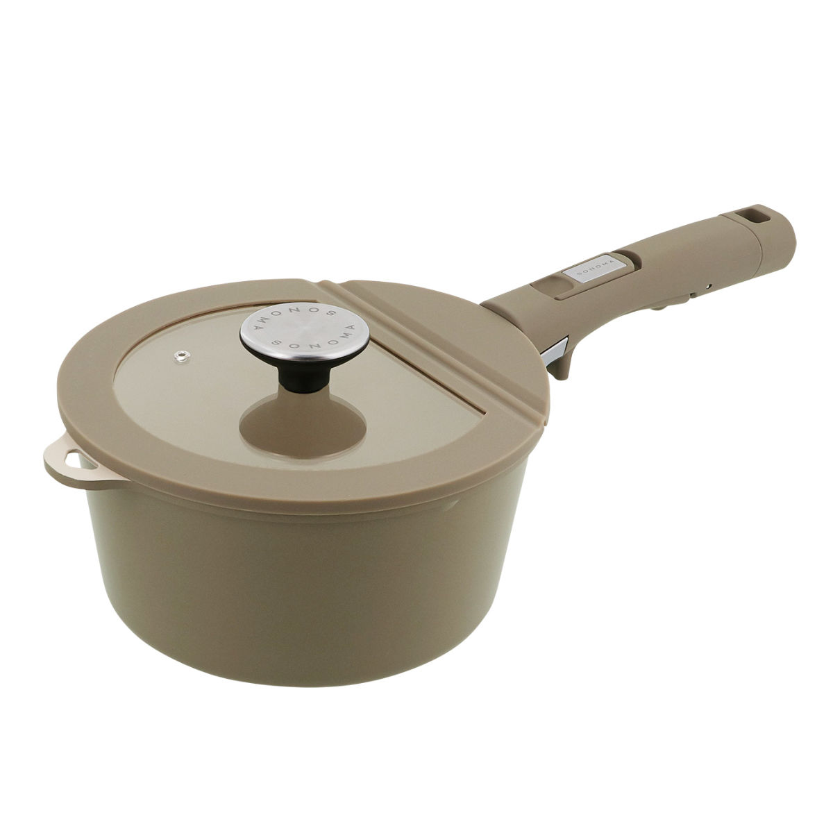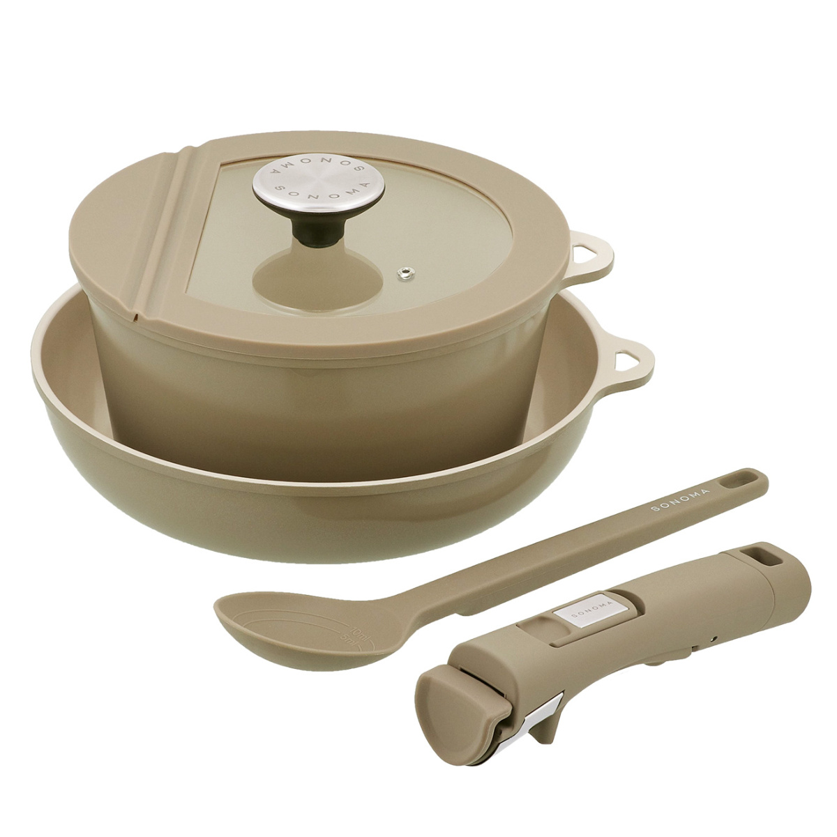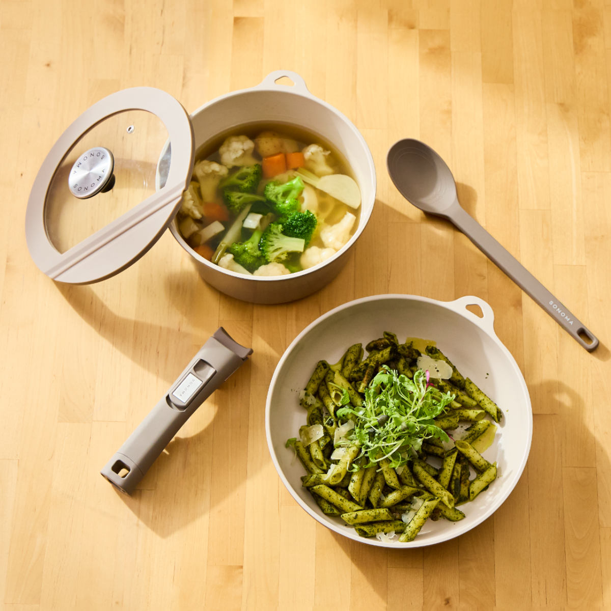 調理から盛り付けまでスマートにこなせる「SONOMA」シリーズの5点セットです。【フライパン 24cm】【ポット 20cm】【ガラス蓋 20cm】【着脱式ハンドル】【調理スプーン】がセットになっています。このセットがあれば基本の調理に対応できるので、新生活を始める方にもおすすめです。