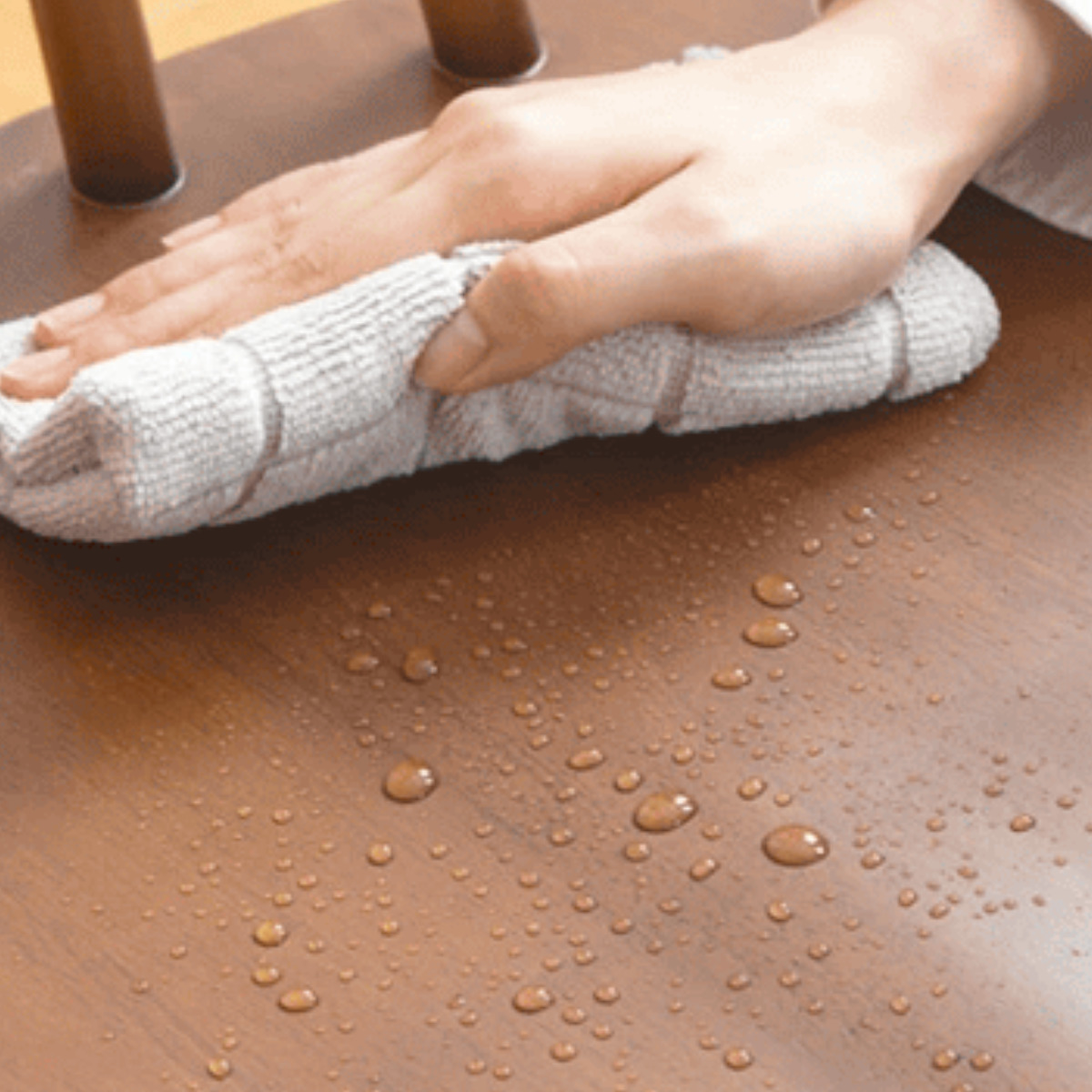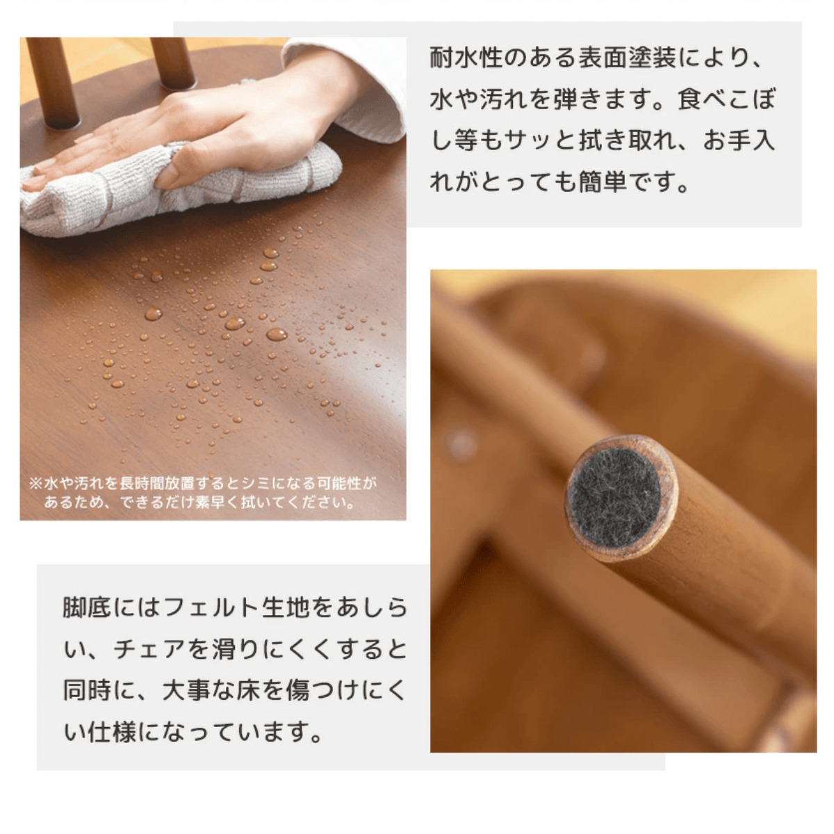 表面には水や汚れに強い耐水性ラッカー塗装を施しています。こぼしてもサッと拭き取るだけなので、お手入れが簡単で清潔に使えます。