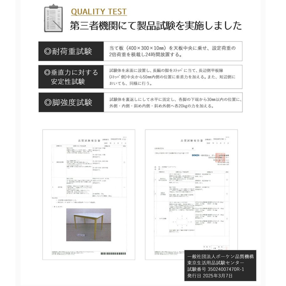 天板は約50kgの耐荷重で、日常使いも安心してお使いいただけます。また、第三者機関による各種試験をクリアし、品質基準を満たしています。