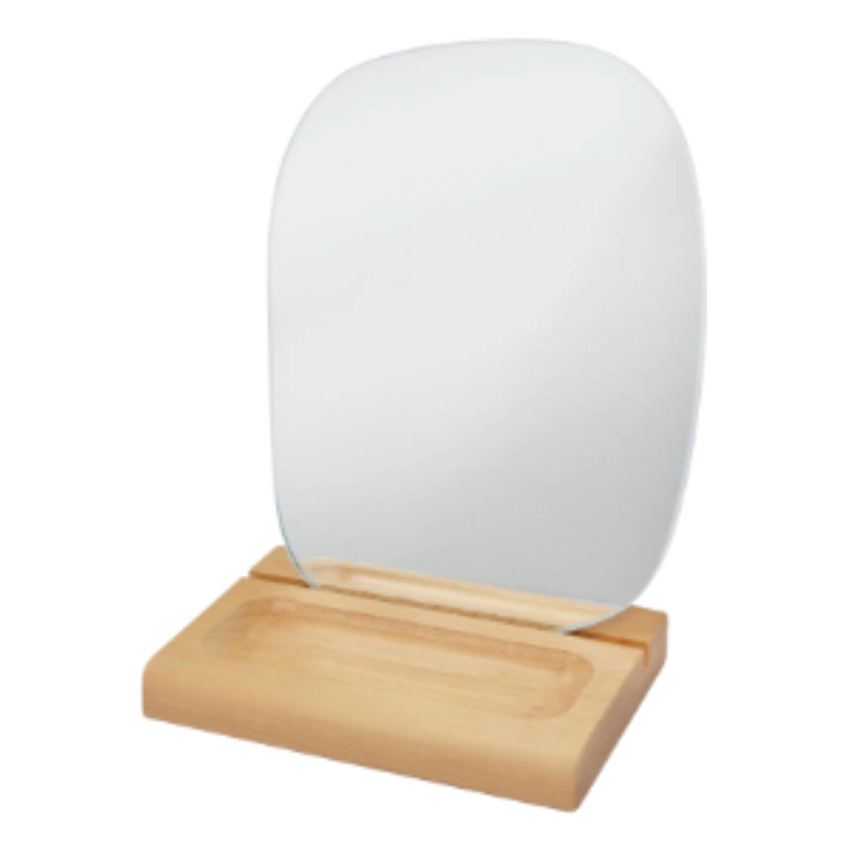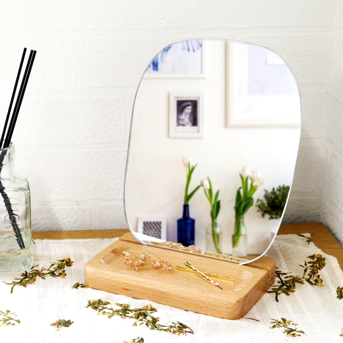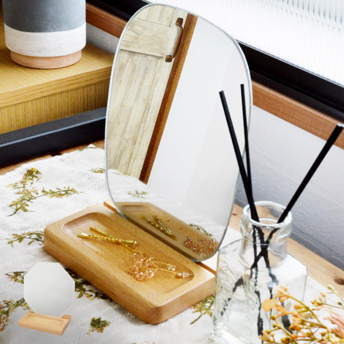 天然木の台座付きミラーです。置くだけでナチュラルなデザインがお部屋にやさしい雰囲気をプラスします。