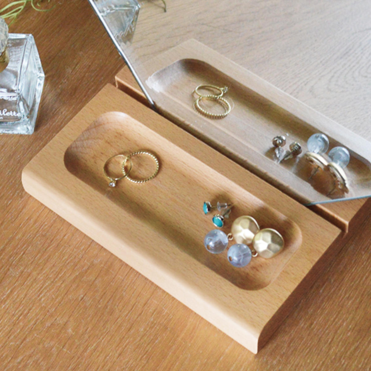 ●天然木を使用したトレー状の台座は、ピアスや指輪などの小物を置くのに便利です。