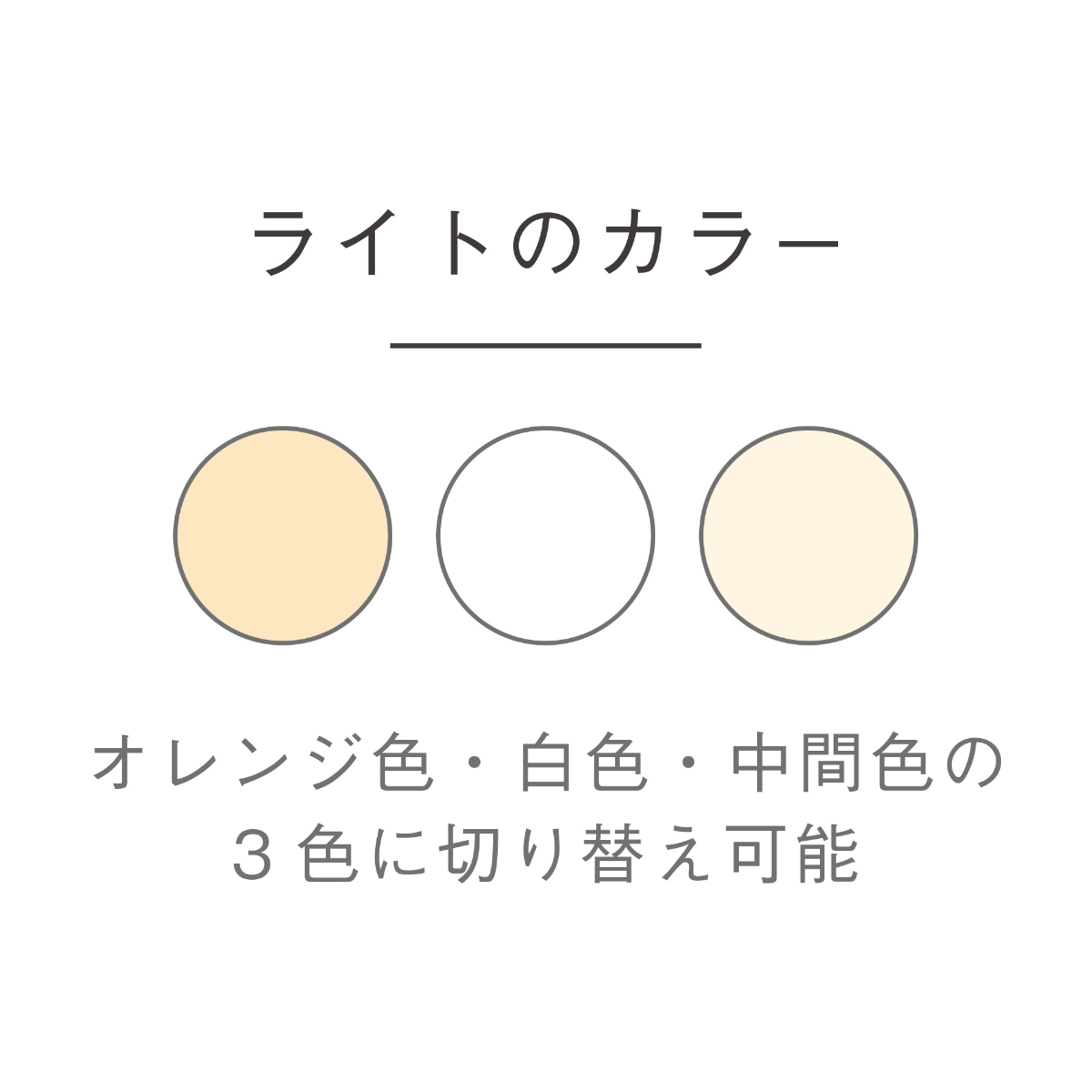 タッチセンサーが内蔵されており、ワンタッチで点灯・消灯ができ便利です。また、明るさを無段階で調節でき、ライトのカラーもオレンジ・白・中間色の3色で切り替え可能です。ちょっと灯りがほしい時や、お休み前のリラックスタイムなど、様々なシーンでご使用いただけます。
