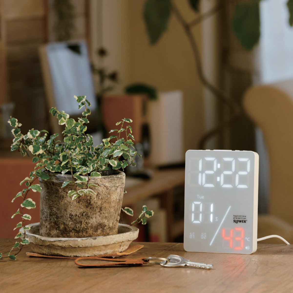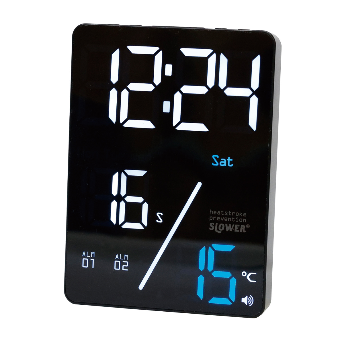室温が一定の温度を超えたとき、熱中症などの危険をLEDの色と音で警告してくれるサーモアラート機能がついたLED時計です。シンプルでコンパクトなデザインながら、時刻、曜日、温度をひと目で確認できます。
