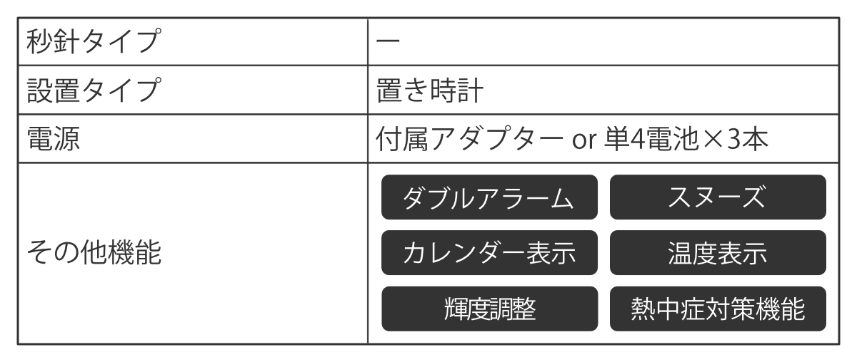 ダブルアラーム機能がついているので、平日と休日などで2種類のアラームを設定できます。朝に嬉しいスヌーズ機能もついています。