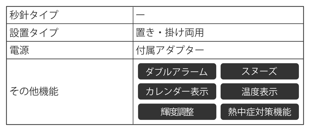 ダブルアラーム機能がついているので、平日と休日などで2種類のアラームを設定できます。朝に嬉しいスヌーズ機能もついています。