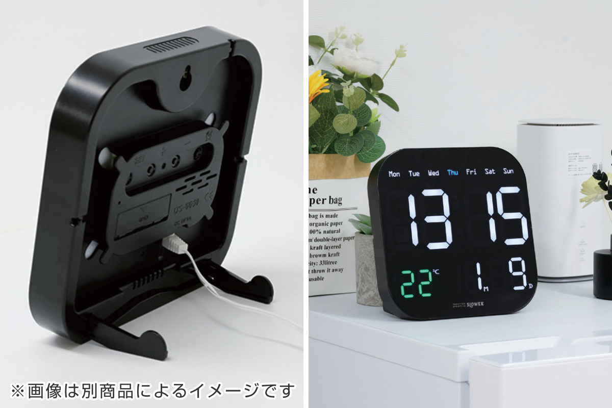 置き時計として使用する場合は、折りたたみスタンドを引き出して表示が見やすい角度で使用できます。
