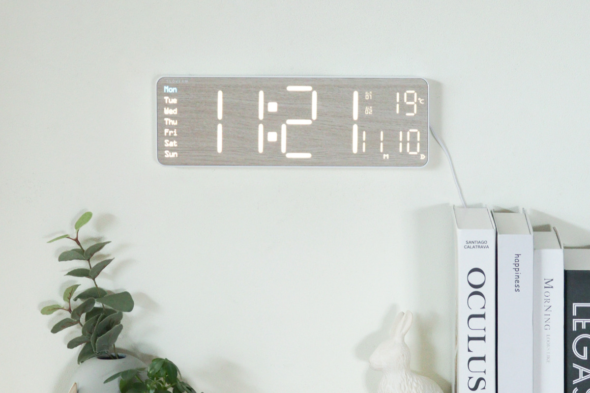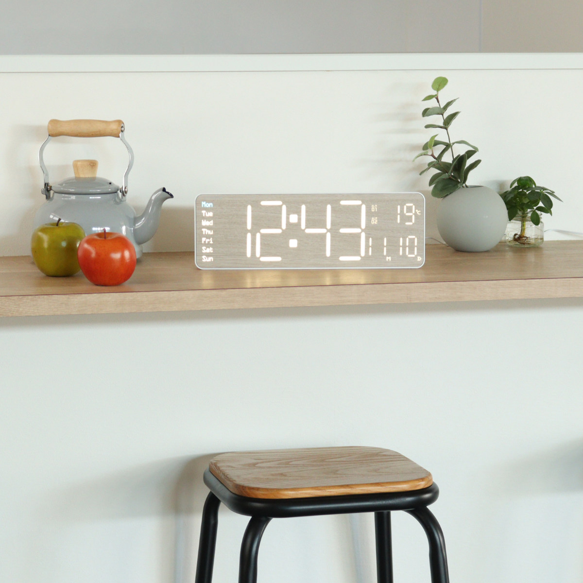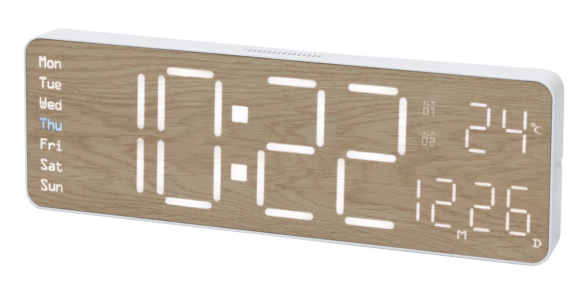 スリムなフォルムと大きな画面表示が特徴のデジタル時計です。時間、日付、温度が部屋のどこからでも見やすく、快適にお使いいただけます。
