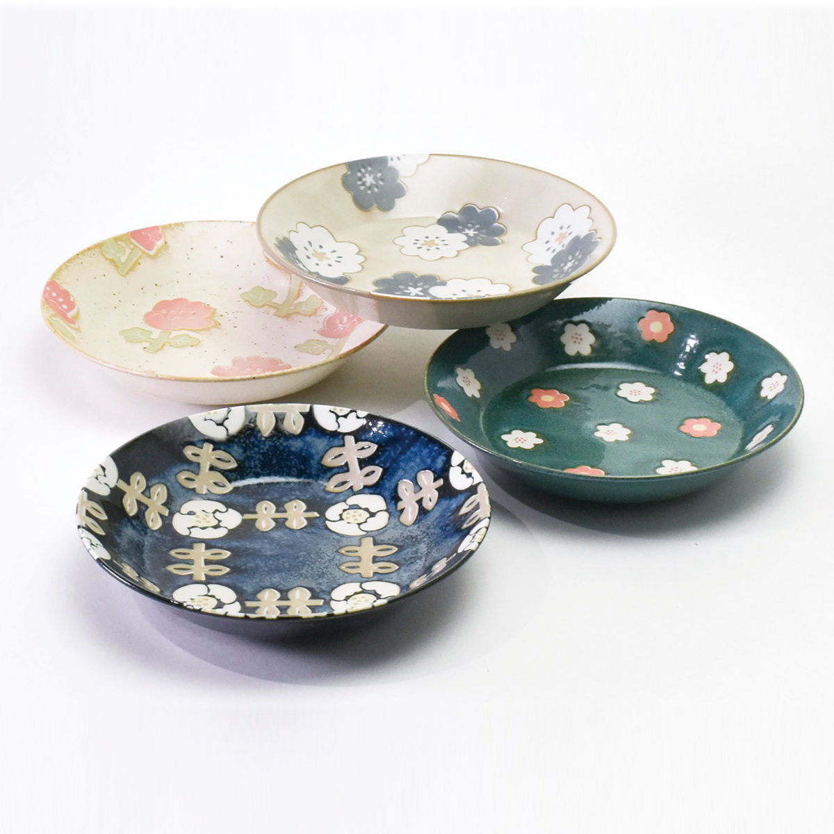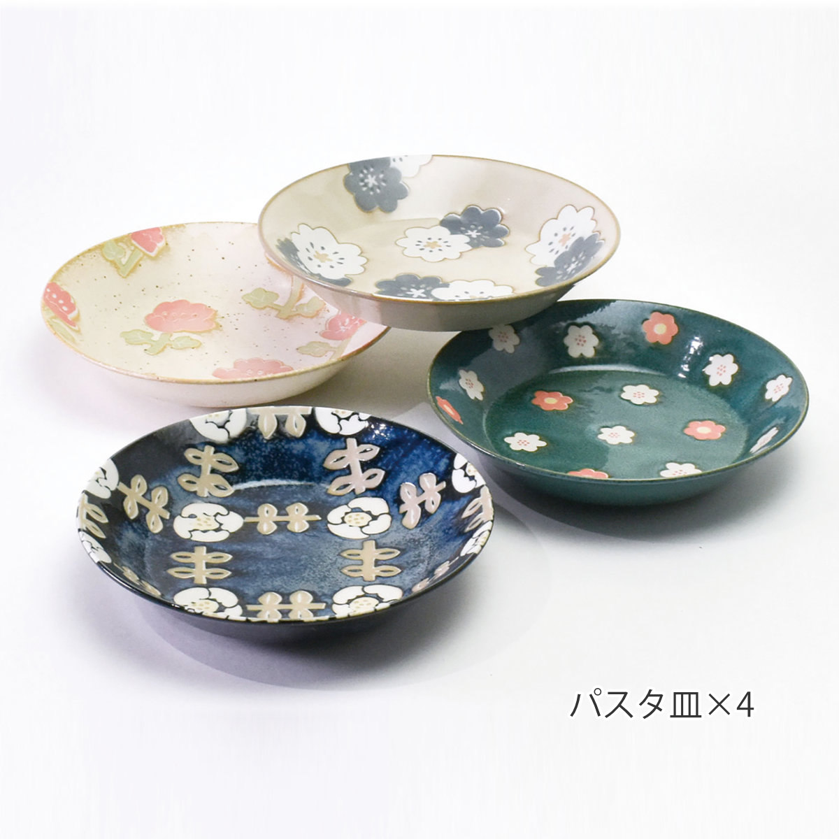 パスタ皿が4枚の食器セットです。個性的な花柄のデザインが食卓に華やかさを添えてくれます。4枚セットになっているのでご家族で色違いで使ったり、来客用の食器としても重宝します。