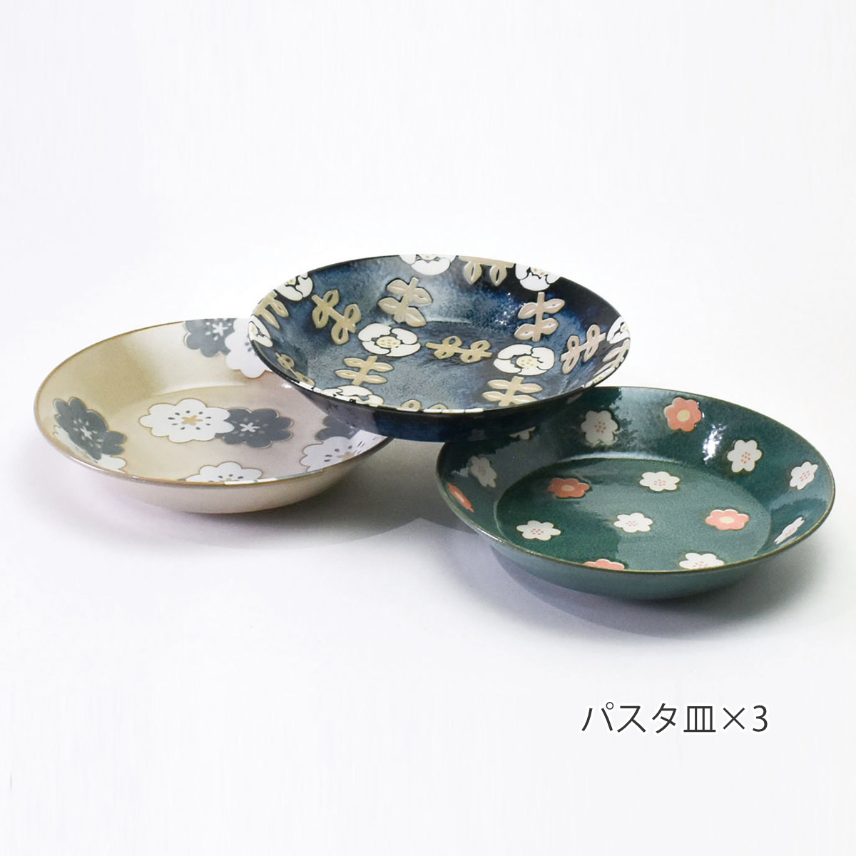 パスタ皿が3枚の食器セットです。個性的な花柄のデザインが食卓に華やかさを添えてくれます。3枚セットになっているのでご家族で色違いで使ったり、来客用の食器としても重宝します。