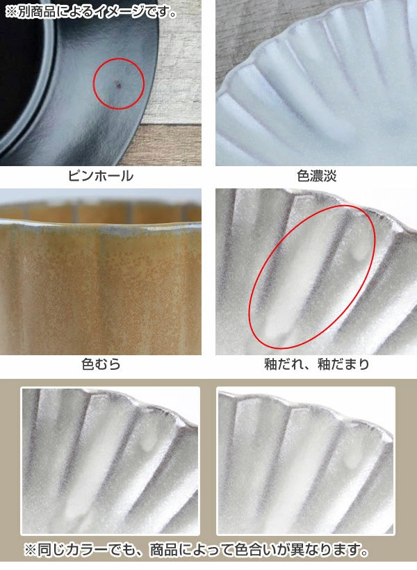 原料や製造方法により、上記のような特性がみられる場合があります。ひとつひとつのうつわの持つ個性、温かみある風合いとしてお楽しみいただければ幸いです。