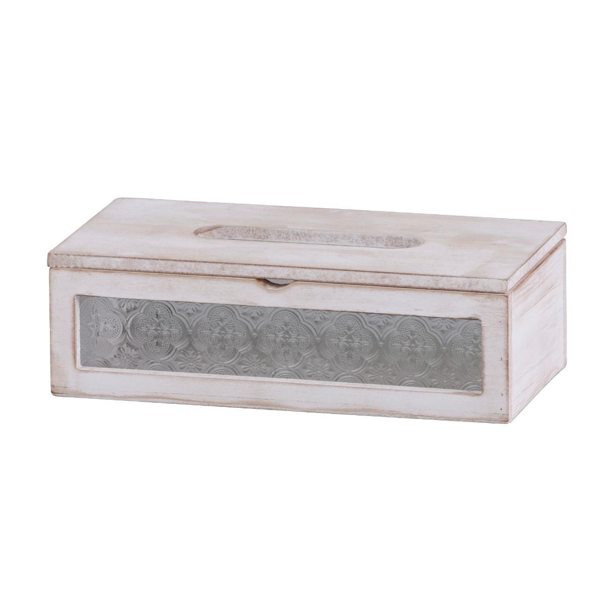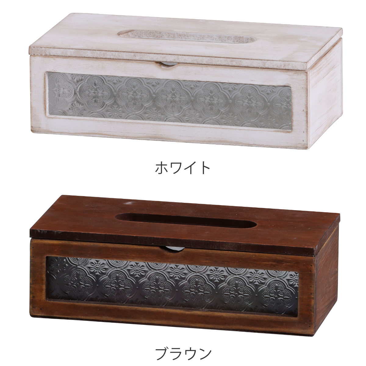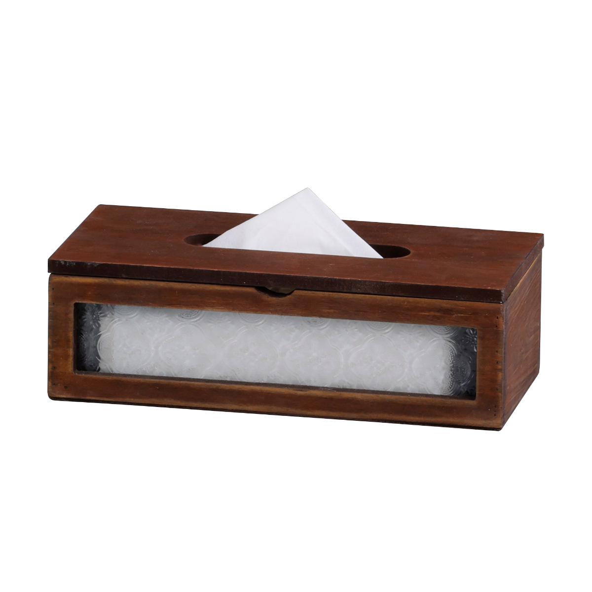 レトロな雰囲気の花柄ガラスがポイントのソフトパック用ティッシュケースです。ウッドのアンティーク感と相まって、温かみのある空間を演出してくれます。