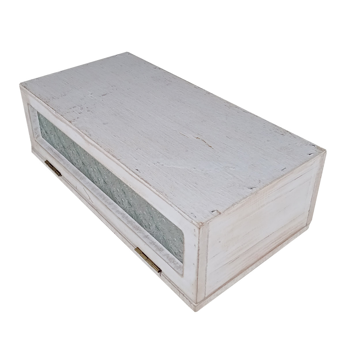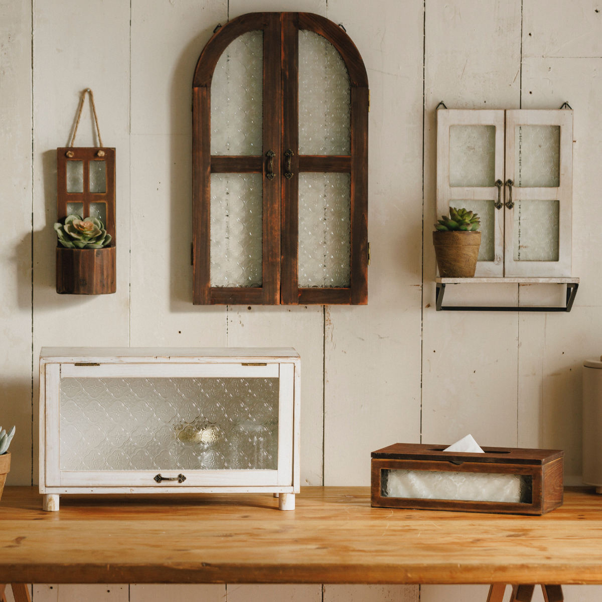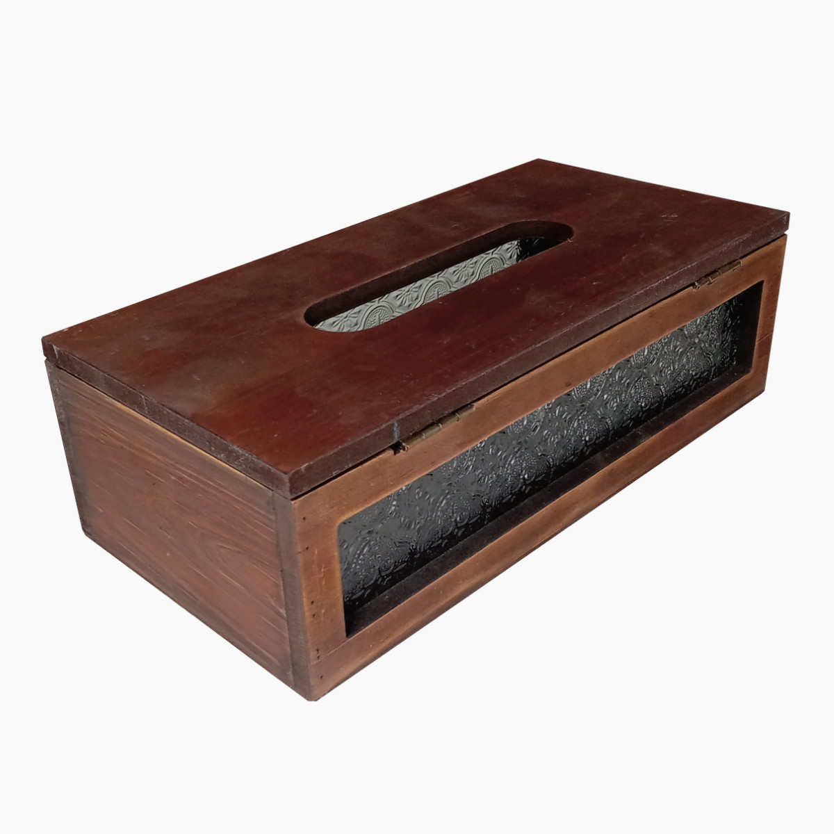 レトロな雰囲気の花柄ガラスがポイントのソフトパック用ティッシュケースです。ウッドのアンティーク感と相まって、温かみのある空間を演出してくれます。