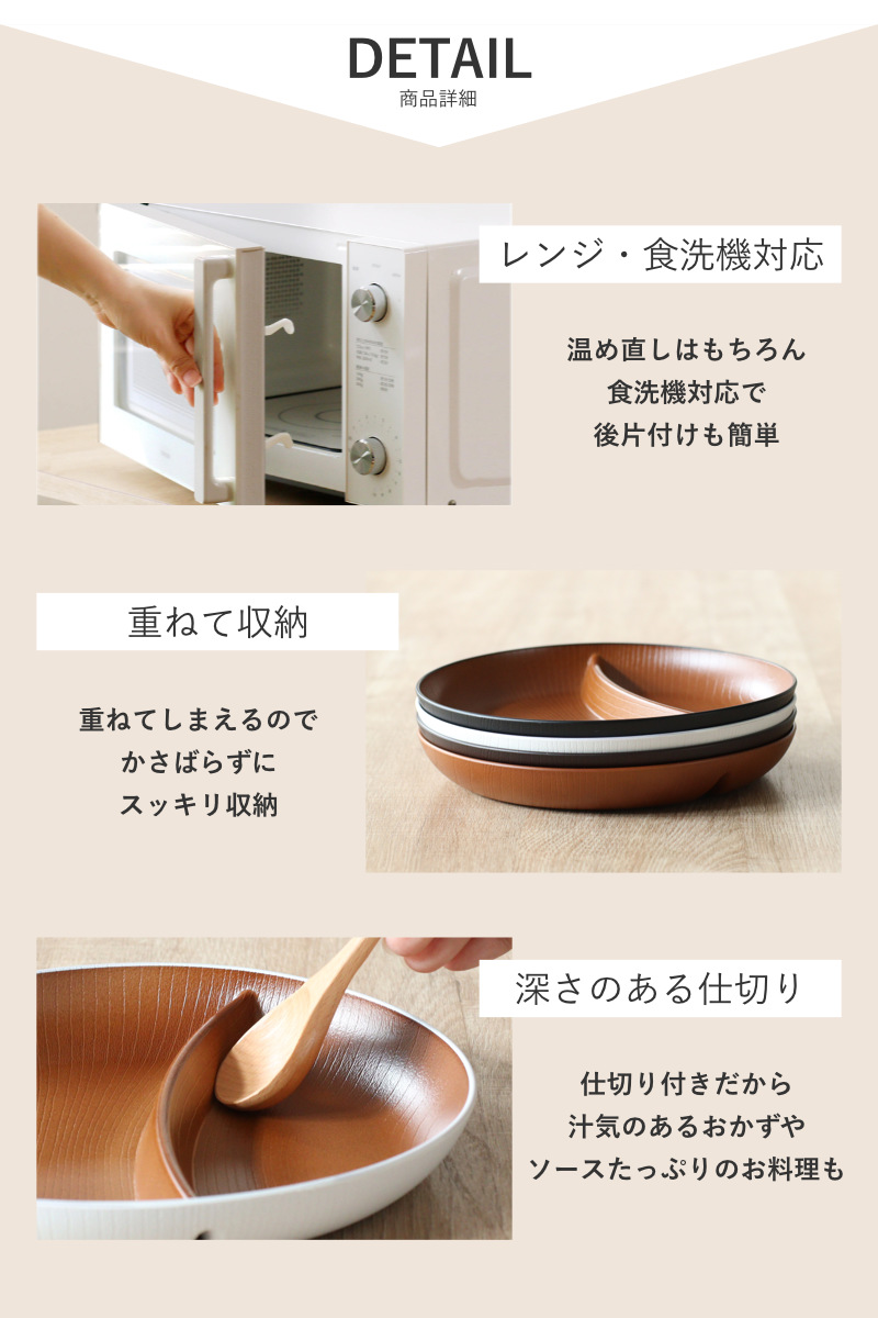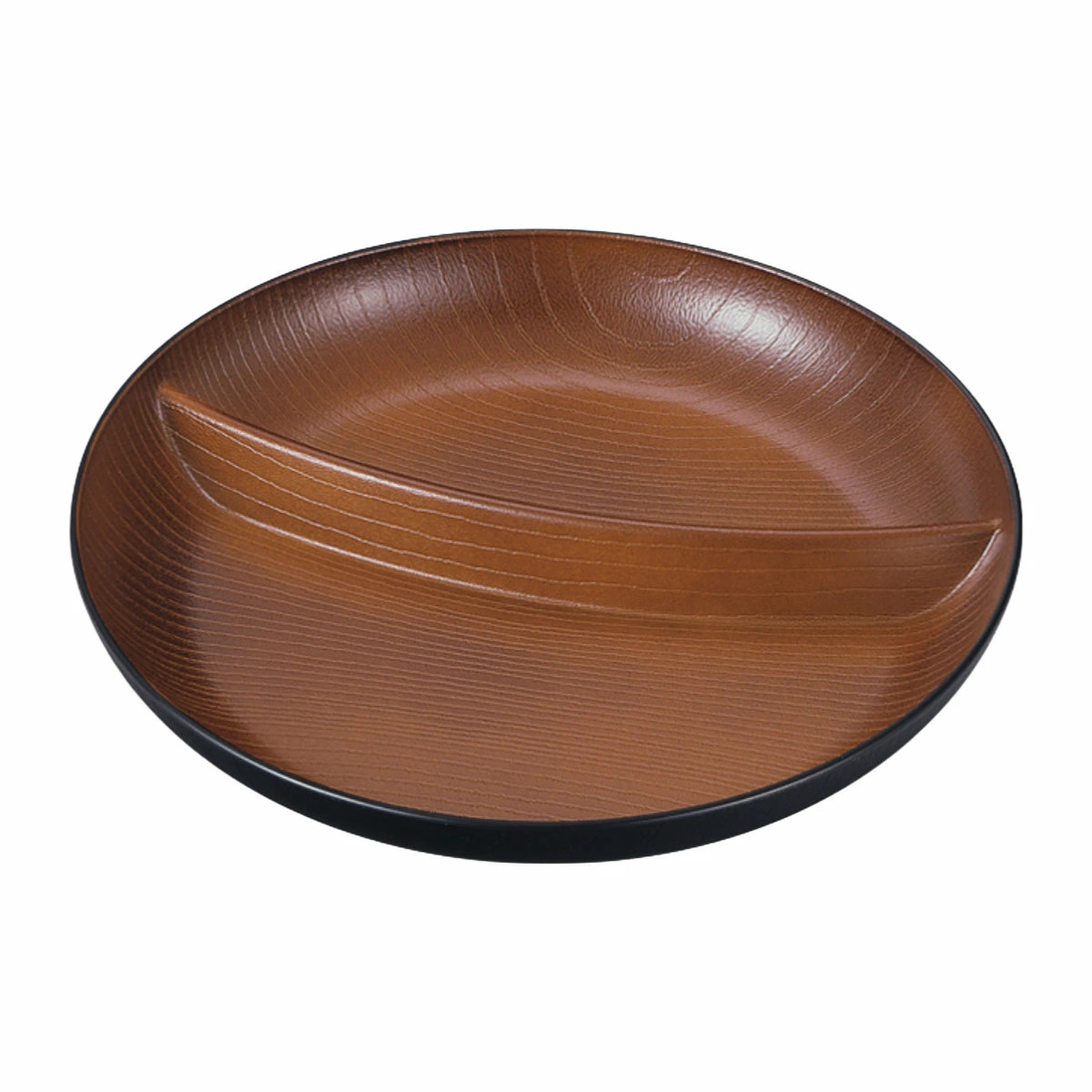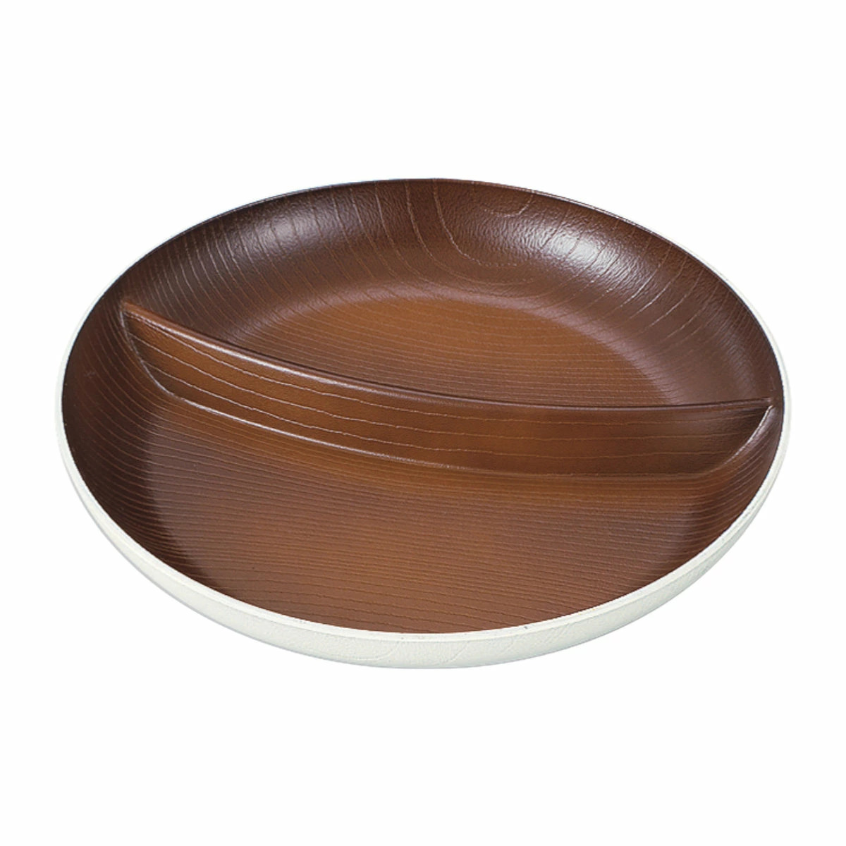 主菜・副菜などを1枚に美しく盛りつけられる、便利な仕切りのあるサークルプレートです。和洋どちらの料理にも馴染むナチュラルな木目デザインが、温かみのある優しい印象を与えます。