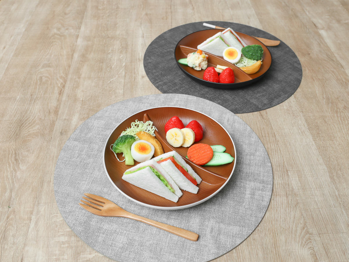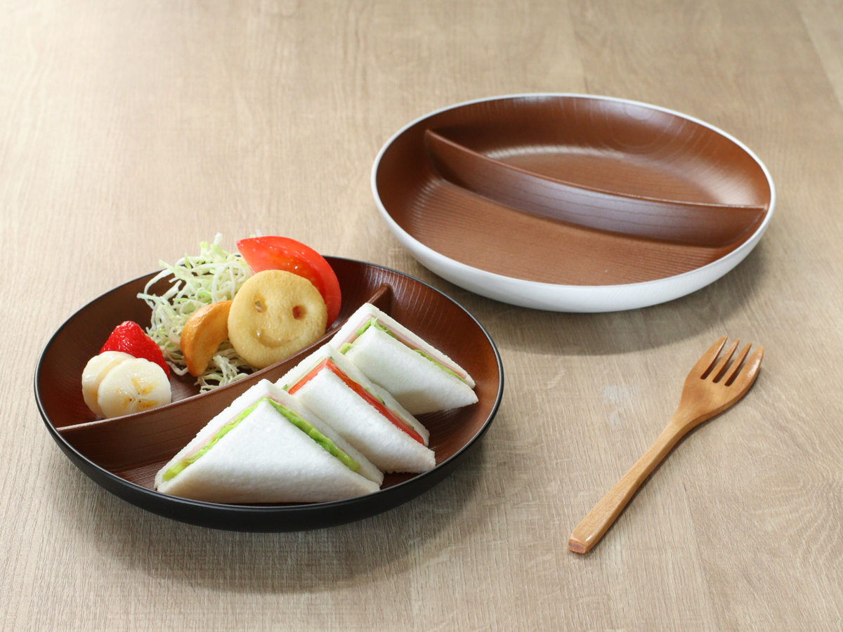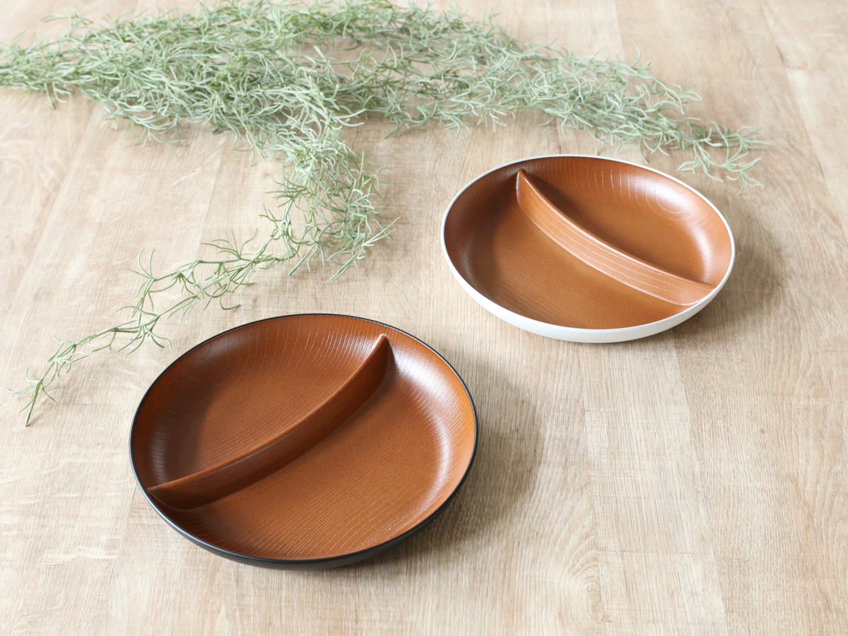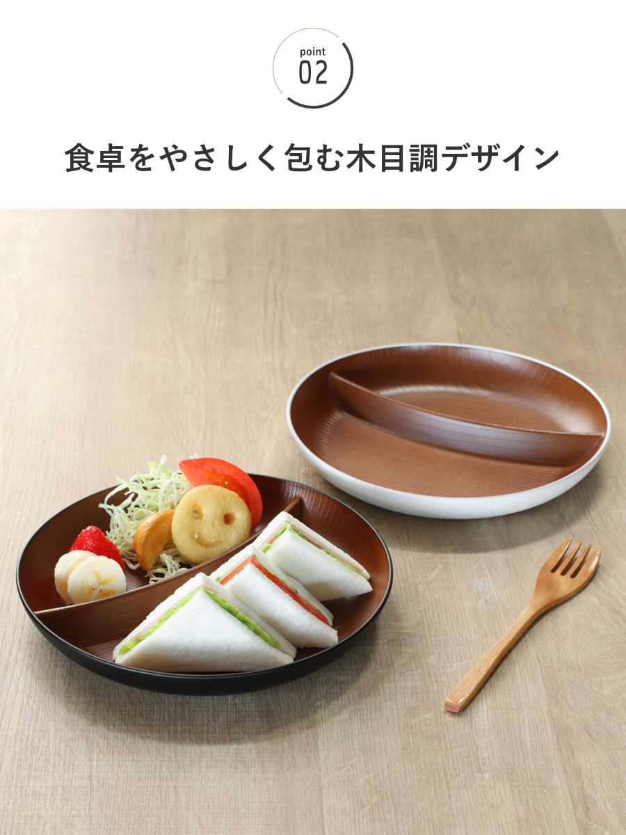 主菜・副菜などを1枚に美しく盛りつけられる、便利な仕切りのあるサークルプレートです。和洋どちらの料理にも馴染むナチュラルな木目デザインが、温かみのある優しい印象を与えます。